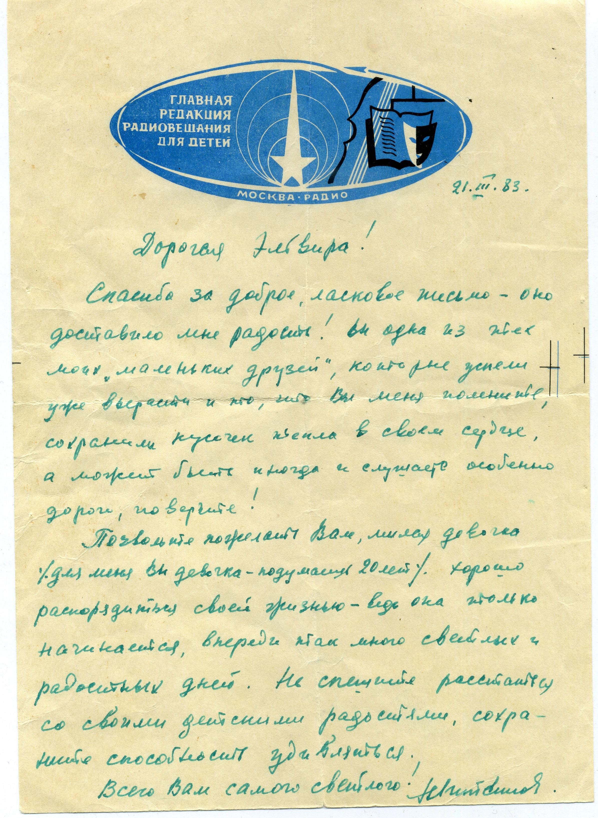 Он озвучил множество пластинок, мультфильмов... Всё лучшее из детства, что я помню, связано и с ним... Как-то я стала замечать, что он пропал с радио... Это было так печально... Сама я получала столько положительных эмоций, и было обидно за детишек, которые этого лишены... Меня переполняло чувство большой благодарности к этому человеку, который мне, маленькой чумазой девчонке дарил чудо!!!... И я решила написать ему письмо... Написать просто... то, что думаю, чувствую... Захотела поблагодарить его за это ЧУДО!!! Это малое и единственное, что я могла для него сделать... Надписала конверт: Москва, Радио. Николаю Владимировичу Литвинову... Дойдёт-не дойдёт- я не знала. Но почему не попробовать? Письмо было отправлено... Я про это позабыла, когда... О, ЧУДО!!! МНЕ ПРИШЁЛ ОТВЕТ!!! Написанное от руки небольшое, но очень дорогое для меня , письмо...