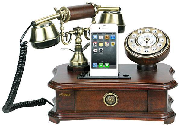 Pyle Retro Rotary Smartphone Station совмещается о всеми мобильными телефонами и планшетами с разъемом 3,5 мм, включая iPhone, Android, Blackberry, iPad и MacBook. Дерево + матовые медные детали, и возможность легко переключаться между стационарным телефоном и подключенным смарт-устройством. Класс!! Звонят тебе на сотовый, отвечаешь в ретро-трубку! И номер набираешь через кнопки на круглом циферблате, используя записную книжку в смартфоне