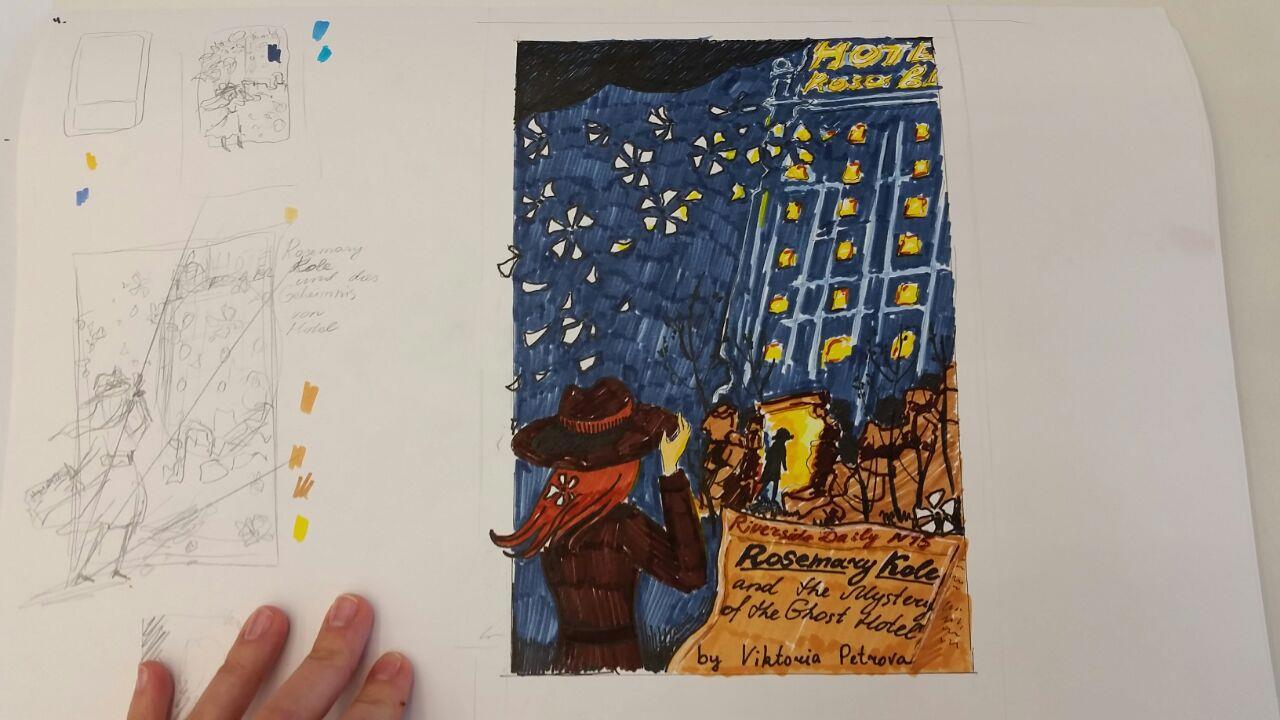 4. Нарисовать обложку к книге, настоящей или не существующей. У меня тогда была написана пара глав о Розмари Коул, поэтому к ней я обложки и нарисовала. На середине у меня высох тёмно-синий маркер)) Вообще это просто зарисовка сна, который мне приснился: он как раз начался с того, что женщина шла за таинственным мужчиной в шляпе в отель.