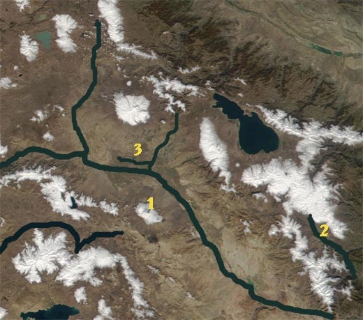 На карте Арарат под цифрой 1 кажется не высоким, но если приглядется, его подножие упирается в реку.