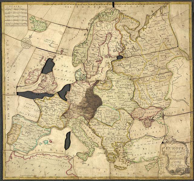 Считается, что это первая специально сделанная головоломка. Карту наклеили на доску и распилили вдоль границ. Всего было пятьдесят деталей, из которых пять (для Шотландии, Ла-Манша, Нидерландов, Корсики и Сардинии) отсутствуют, а часть для Финского залива повреждена.
