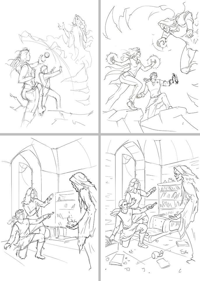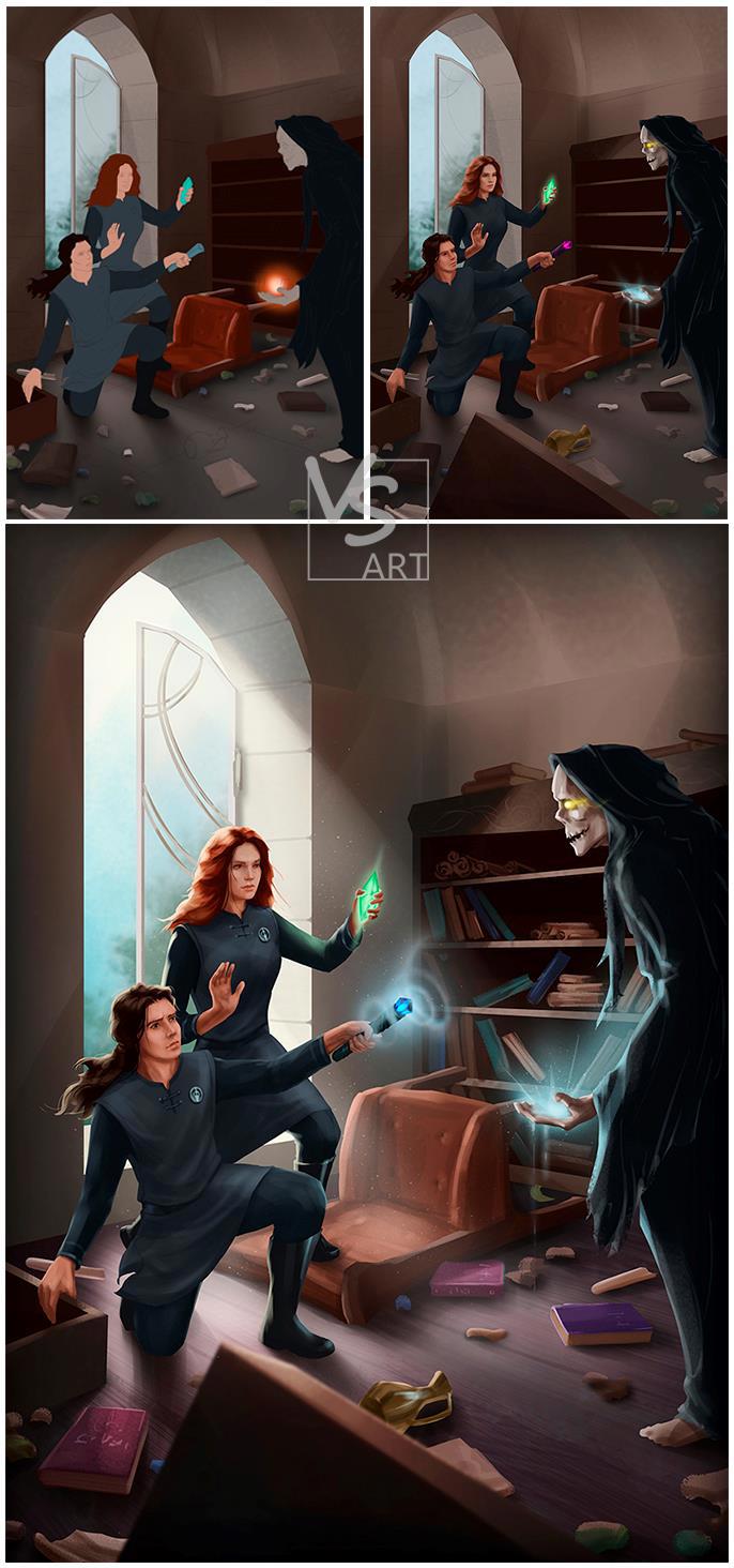 Автор: Салихов ВасильПолучив задание от Александры на создание новой обложки для романа "Адепты смерти", я сразу же представил себе описанный момент. Однако, как оказалось, не так-то просто найти правильный ракурс для композиции. В итоге последовательно появились несколько эскизов: