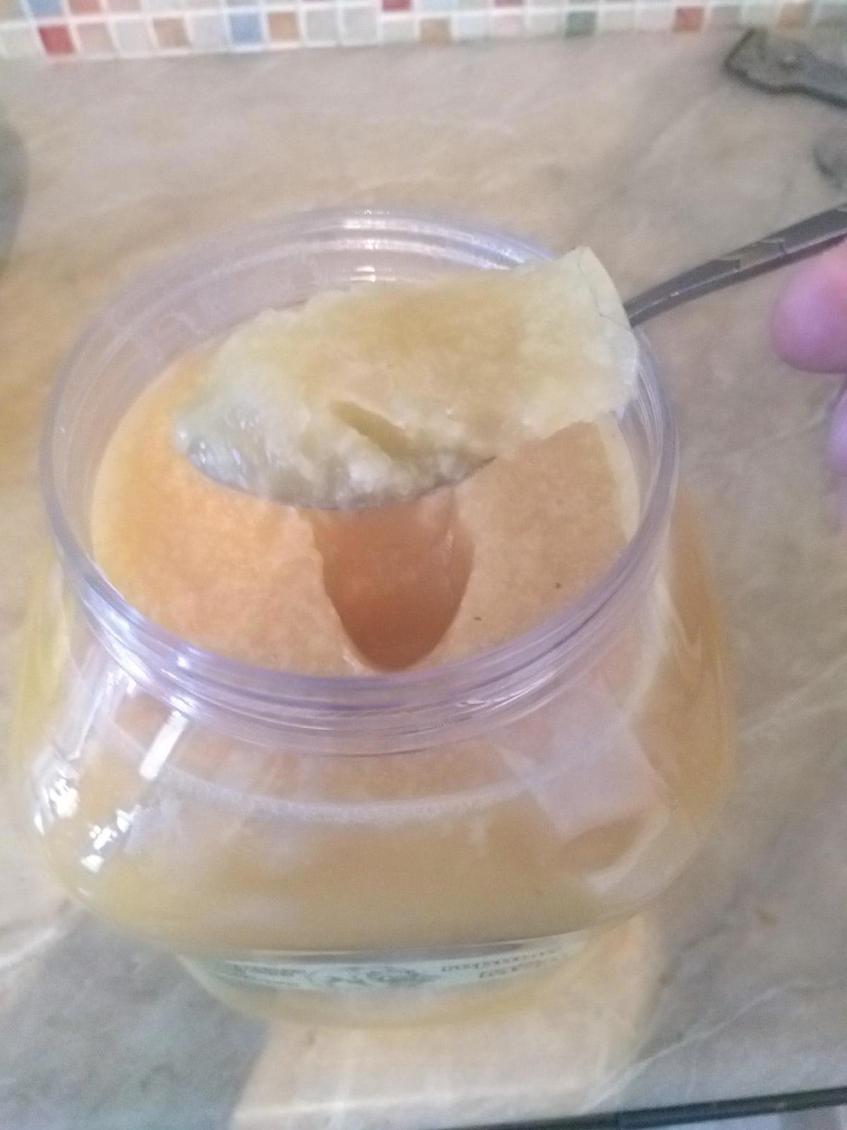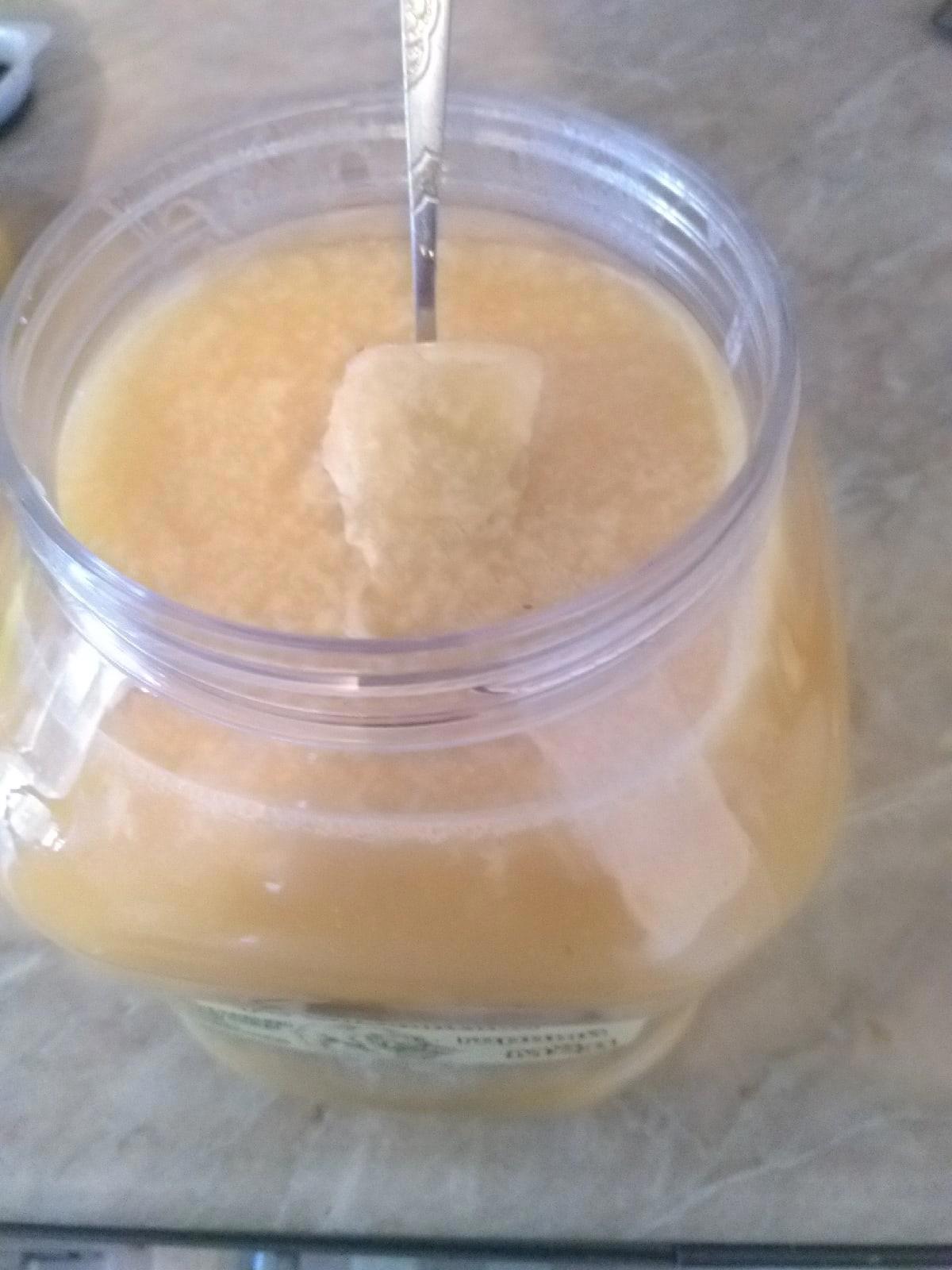 Признаюсь честно, я не ценитель мёда, супруга – да, детям полезно, а я, так больше по полусладкому, чем по сладкому. Однако уже внешний вид привлёк моё внимание. Я могу и ошибаться, но в мёде приметил мелкие крупинки, которые похожи на остатки сот.