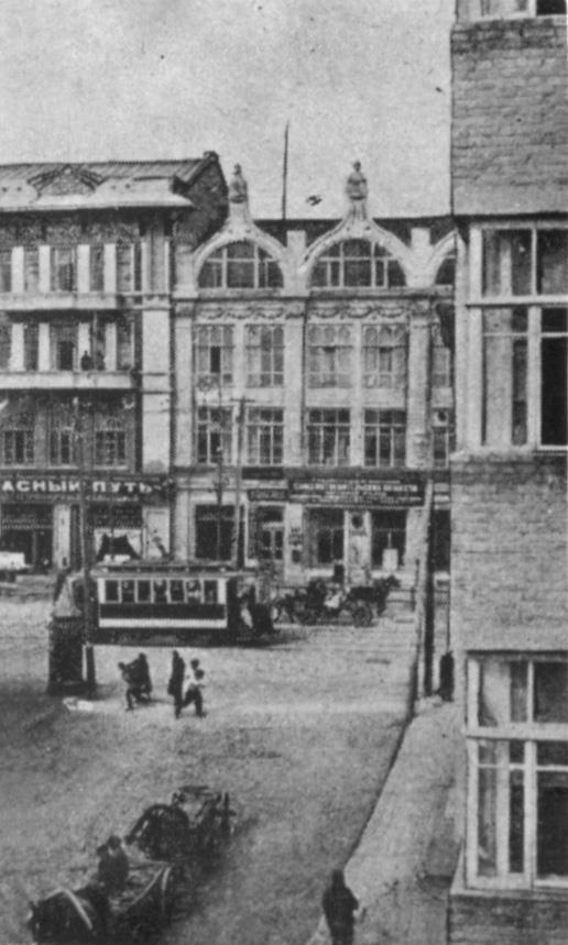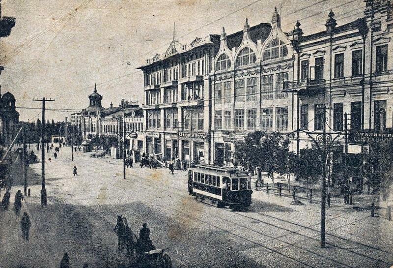 1940-й, снова Нижняя Октябрьская (бывшая Александровская, ныне - часть проспекта Ленина), но гораздо ближе к Царице - сейчас трамвай свернёт налево - на улицу Ленина (бывшую Успенскую) возле кинотеатра "Красноармеец" (бывший "Парнас" - https://author.today/post/88341 ), на противоположной стороне, на улице Октябрьской (да, было такое, что бывшая Александровская "раздвоилась" на Октябрьскую и Нижнюю Октябрьскую, и этому были причины: во-первых они разделены сквером, как и сейчас проспект Ленина в этом месте, а во-вторых Октябрьская заканчивалась упираясь в тогдашнюю площадь Павших Борцов Революции, а Нижняя Октябрьская продолжалась дальше - до Октябрьской площади) уже вероятно знакомые читателям здания - https://author.today/post/118509 и https://author.today/post/124028 ):