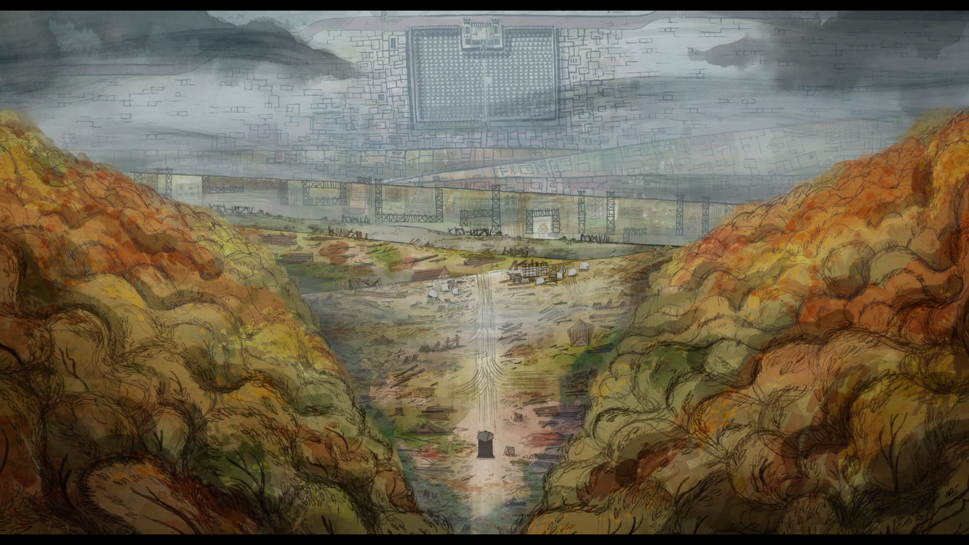 Перво-наперво, что отличает работы студии вообще, да и эту в частности, это картинка. Или даже картина. Причём тут не просто декоративная услада для глаз, ну тех которые такое оценят. Художники злоупотребляют осмысленностью почти каждой завитушки, каждого штриха. В каждом мультфильме по своему. В этом работает цвет и острота, упорядоченность формы. Вот наглядный пример: