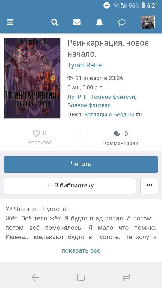 Автор: TyrantRetreИтак, я TyrantRetre, я только недавно начал в роли автора. Но к сожалению делаю ошибки, как орфографические, так и другого характера. Недавно закончил написание первой книги. Она короткая, и является первой книгой из цикла... у, короче, я занят написанием 2й книги. В промежутке между ними могу публиковать рассказы.