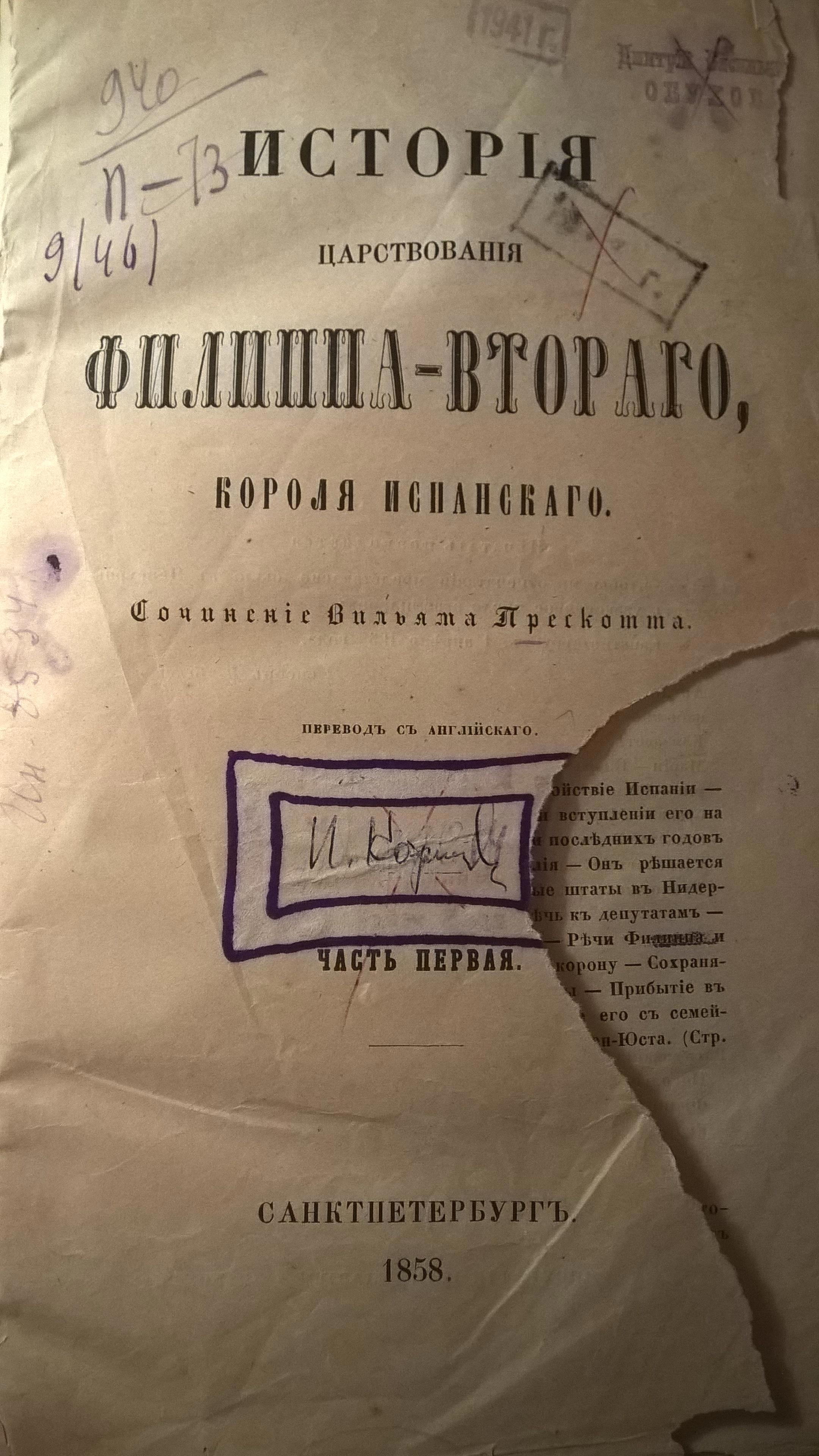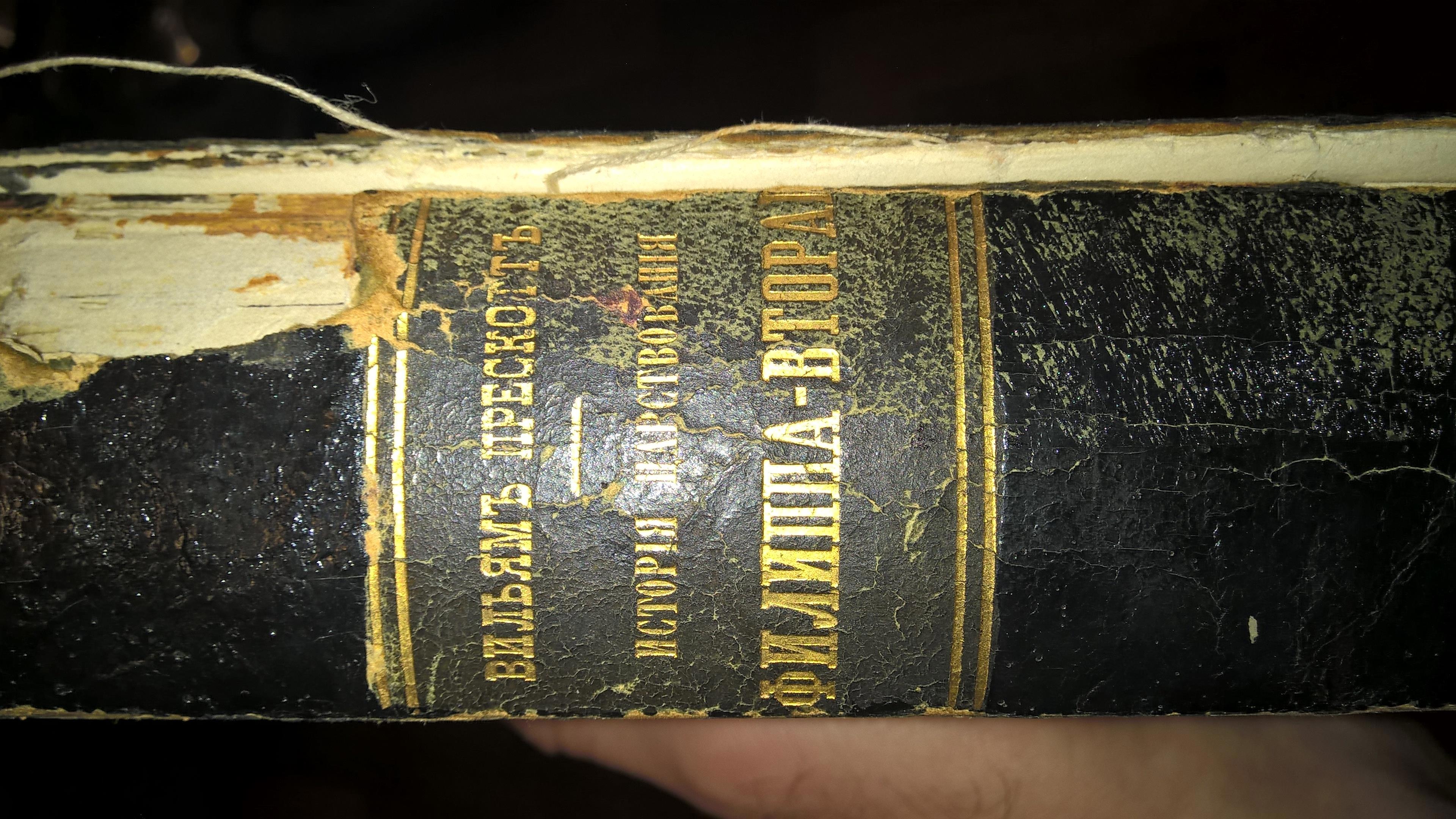 Вот, например, Вильям Прескотт. История царствования Филиппа Второго, короля испанского, 1858 года. Это было моё самое первое драгоценное приобретение. Жил я в рабочем районе, стипендия была 40 рублей, из которых 30 я отдавал родителям, а 10 оставались мне на всё, что душа не пожелает. И вот как-то возвращаясь из универа, повстречал на лестничной клетке пропитого алкаша, который спросил: книжку, типа, ннада? Я: какую?