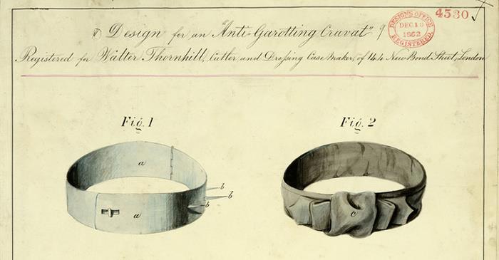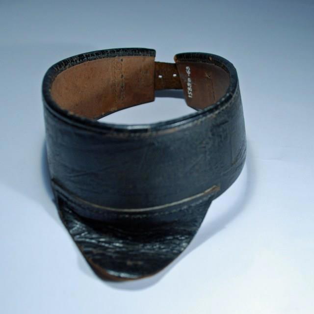 В The National Leather Collection есть пять образцов ошейников против удушения, используемых полицией. Они выполнены из темно-коричневой кожи, закрываются пряжкой сзади и имеют дополнительную защиту горла. На одном ошейнике стоит клеймо производителя: "WD Bryan Brothers & Co. 9 Dacre Street, Westminster, 1874". На фото ниже всё таки один из первых подкладов)
