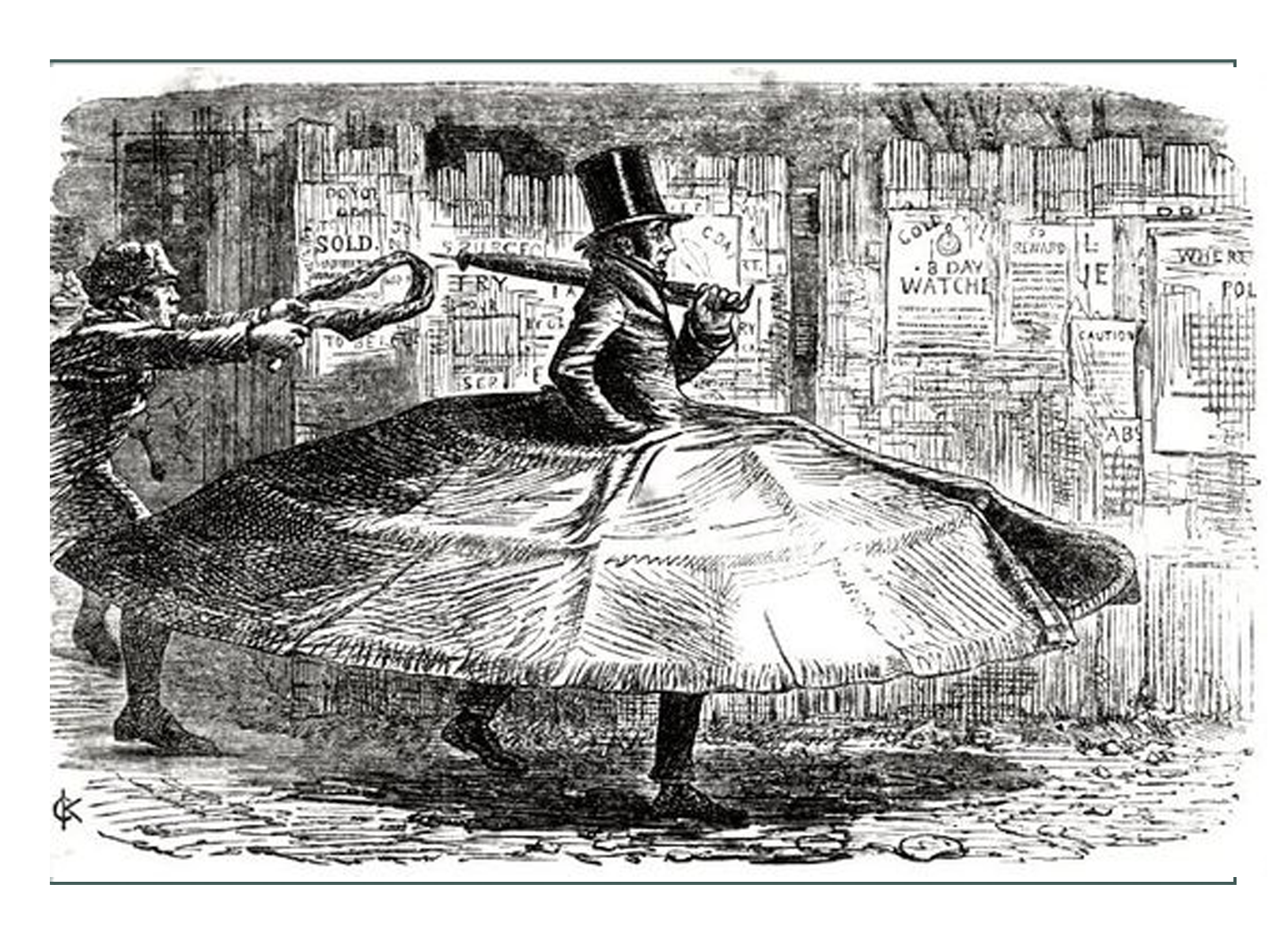 Под карикатурой была фраза "Мистер Трембл позаимствовал кринолин своей жены" ("Punch" от 27 декабря 1856 года)