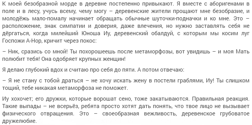 Да, дальше по тексту будут бои, кровишка и интриги, но разве не прекрасен момент спокойного внедрения землянина-этнографа Ника в местную нечеловеческую цивилизацию? А что может это показать лучше, чем мирные и совместные работы в поле?