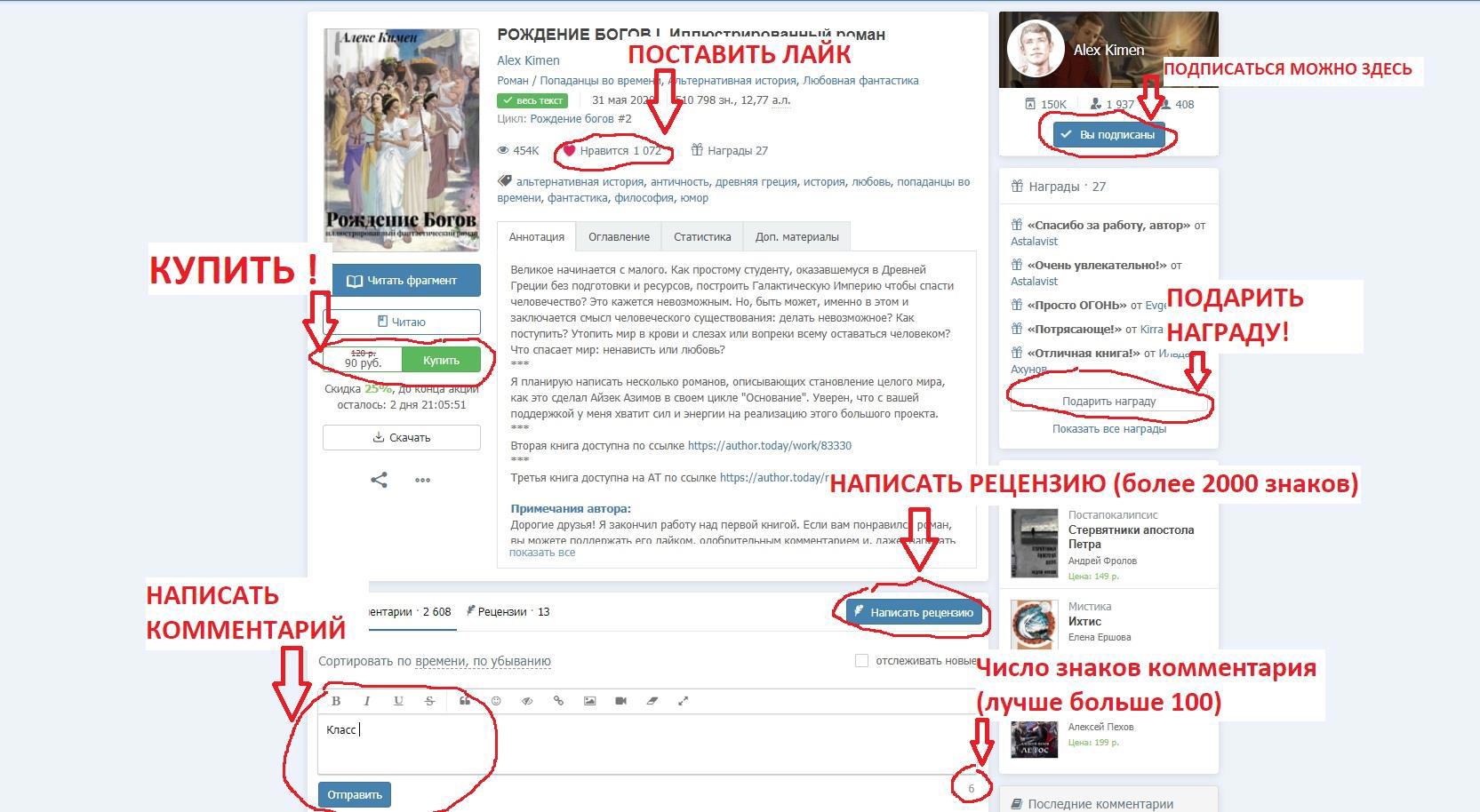 НО авторы жадные до славы и пиара. Им и этого мало. Если, вдруг, вы решитесь потратить силы и напишете рецензию (или хотя бы развернутый комментарий). Не поленитесь, пожалуйста, сделать еще один маленький шаг и разместить ее на сайте Лайвлиб https://www.livelib.ru/work/1003985887-rozhdenie-bogov-aleks-kimen , а еще лучше, заодно, отметить книгу автора и на Литресе https://www.litres.ru/aleks-kimen-24362138/rozhdenie-bogov-i-illustrirovannyy-roman/ (если она там есть)
