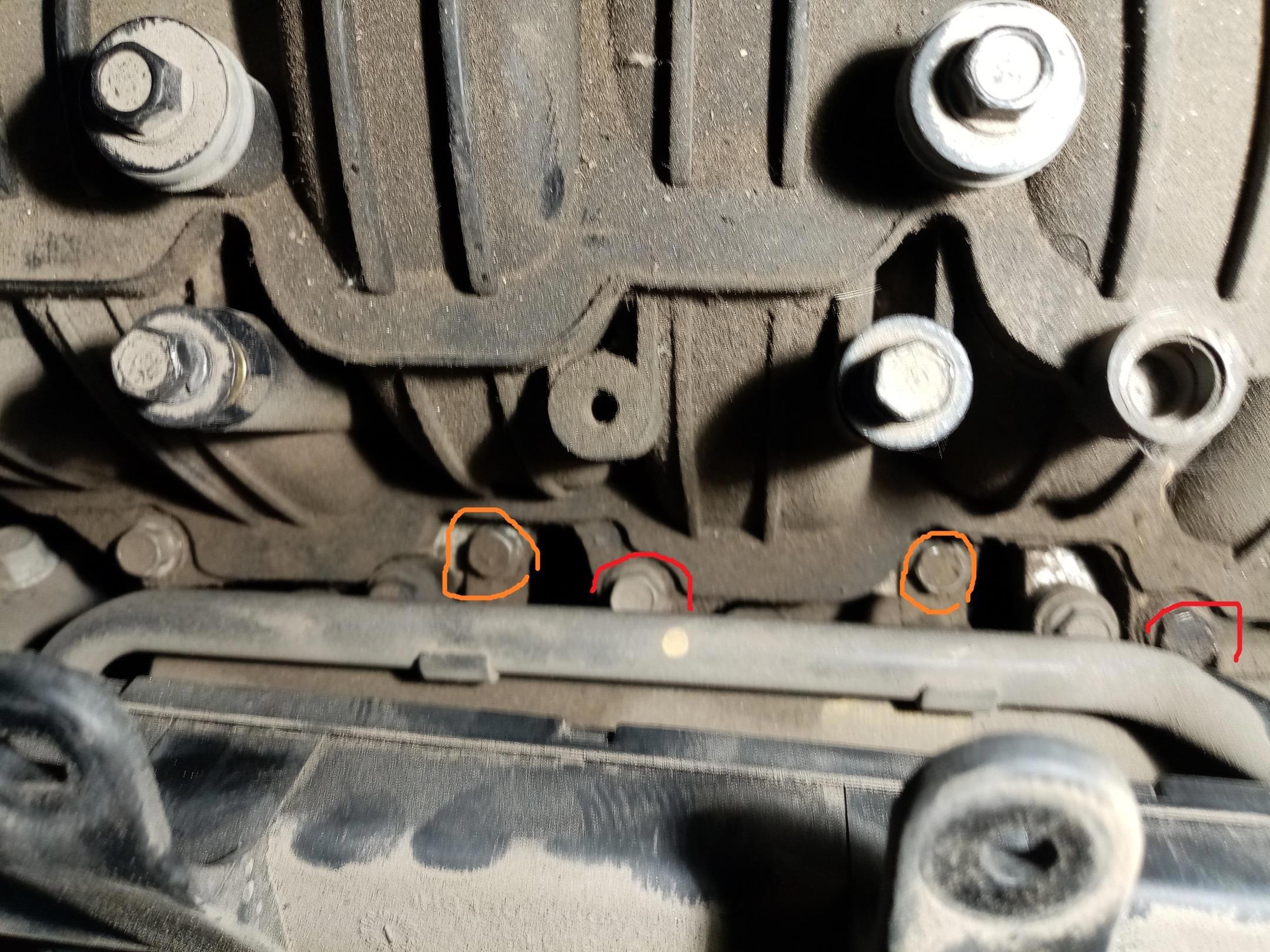 Красным отмечены болты, крепящие коллектор, оранжевым - болты, крепящие вентиляцию.