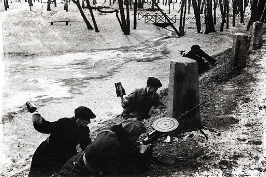 Советские бойцы отрабатывают противотанковую атаку с бутылками с горючей смесью