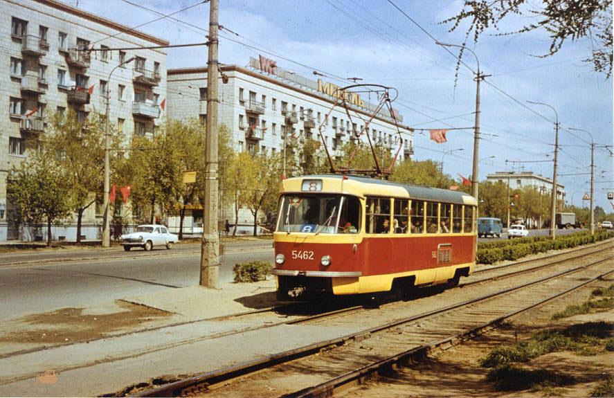 На маршруте №10 на пересечении Советской и Аллеи Героев. Обратите внимание на то, что бортовые номера вагонов (как и троллейбусов, и автобусов) стали уже четырёхзначными - первая цифра обозначает номер депо (для автобусов - парка) - на такую номерацию перешли в 1975 году. Вагоны ещё двухдверные, более поздние будут трёхдверными: