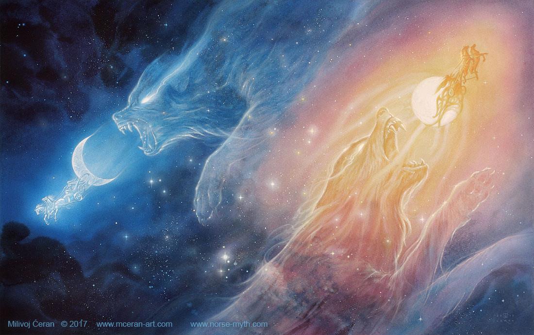 Но, что любопытно, в перерывах между откусыванием рук, разрыванием пут и сидением на цепи, Фенрир успел произвести на свет, по меньшей мере, двоих очаровательных щенков. Один его сынишка — Хати Хродвитниссон («Ненавидящий, сын Волка славы»), тоже варг, который, в день Рагнарёка, проглотит Луну. Его же родной братишка Скёлль («Предательство» или «Насмешка») догонит и сожрет Солнце. Имя матери волчат нигде не указывается, но известно, что она была великаншей и жила на востоке Срединного Мира Мидгарда, в Железном Лесу Йарнвиде. Снорри Стурлуссон в «Младшей Эдде» утверждает, что, кроме двух небесных варгов, она выносила огромное потомство, и все ее дети были гигантскими волками.