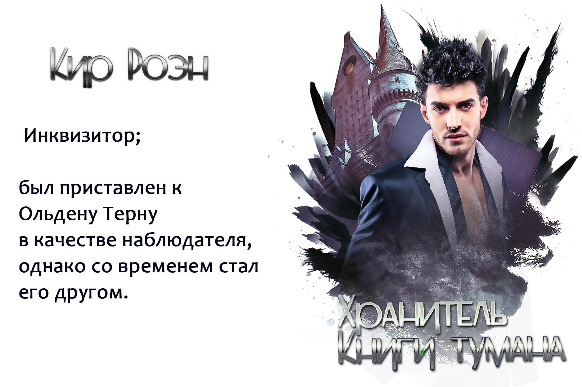 Кир Роэн - инквизитор, единственный (до появления хранителей) друг Ольдена. Роль его изначально неоднозначна из-за рода его занятий. Инквизиция в романе "Хранитель Книги тумана", понятное дело, отличается от исторической организации. Задача "местной" инквизиции - многоуровневой разветвленной организации - следить, чтобы уровень магического воздействия в пределах подведомственной территории, не превышал допустимый (в противном случае, будет запущен процесс дестабилизации Завесы и демоны таки прорвутся сквозь нее), выдают разрешение на занятие магической деятельностью, они же занимаются ликвидацией нечисти, ежели таковая появится.