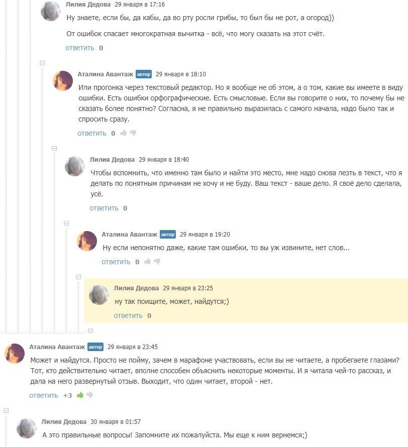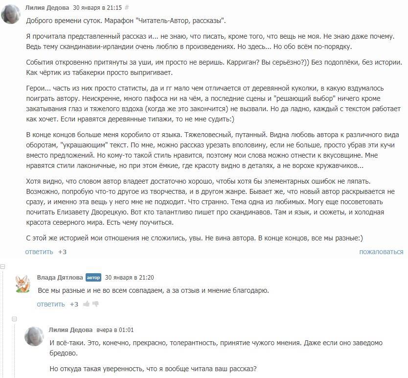 Я, если что, сейчас не призываю бросаться на амбразуры от лит-ры и рвать глотки в бессмысленных спорах под своими текстиками. Нет. Это действительно личное дело каждого, как он реагирует на критику и хочет ли вообще реагировать хоть как-то. Я всего лишь предлагаю быть честными. Если вам принесли каку, назовите это тем, чем оно и является. Не надо натужных благодарностей. Когда гидру колят в жопу иголкой, она не благодарит, она выпускает в уколовшего ядик.