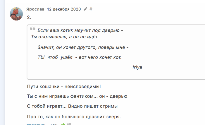 3. Если вы хотите, чтобы в конкурсе поучаствовал ваш остроумный ответ кому-нибудь, то оформляете его вместе с цитатой, на которую отвечали. Да, делаете это новым постом/комментарием.