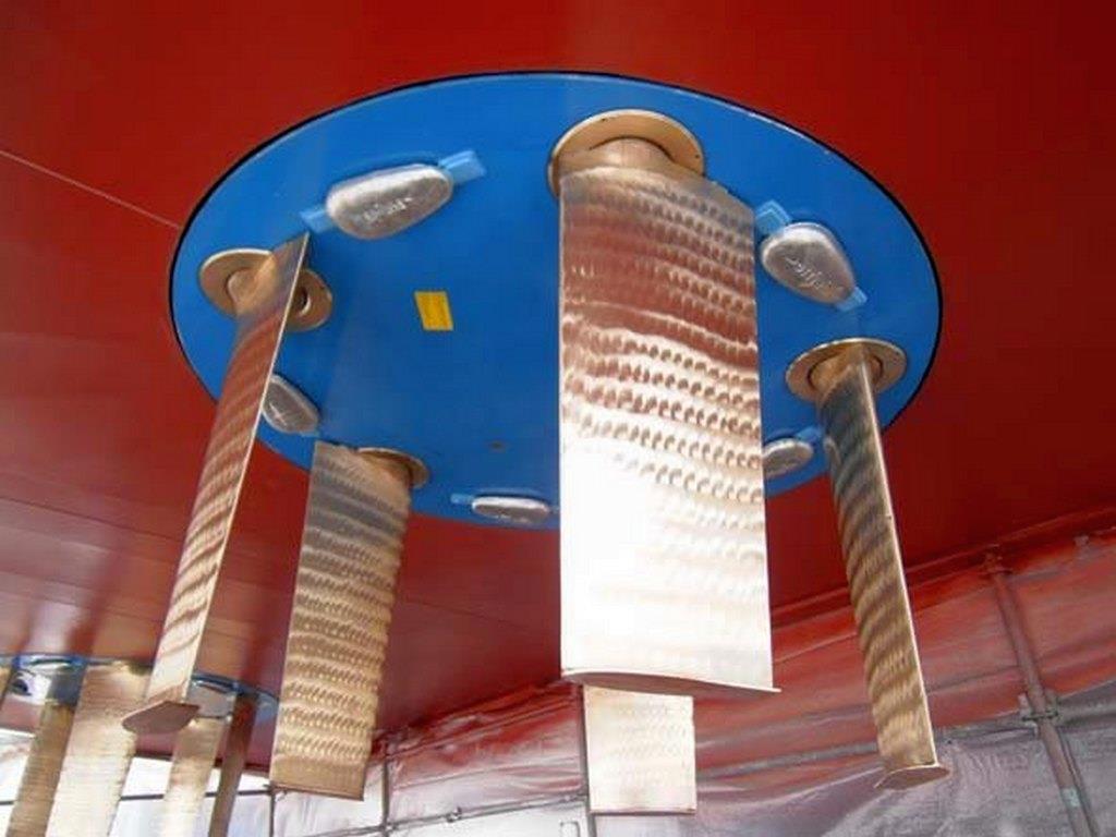 Были разработаны и другие варианты колёсного движителя. Конструкции, методики расчётов… всё это было разработано ещё в самом начале 20 века. (Мы, кстати, при проектировании колёсного движителя пользовались книжкой 30-х годов). Винты также развивались и оказались более универсальными. В результате колёса сейчас не анахронизм, а скорее техническая экзотика. Есть ещё один вариант, который в принципе можно отнести к родственнику гребного колеса – это крыльчатый движитель. Преимущество такой штуки в том, что она может толкать воду в любую сторону. То есть никаких подруливающих устройств ему не нужно. Второе – он толкает воду с одинаковой силой. Это называется упором. Отсюда и применение – буксиры, работающие в ограниченных акваториях. Выглядит на днище такая штука вот так: