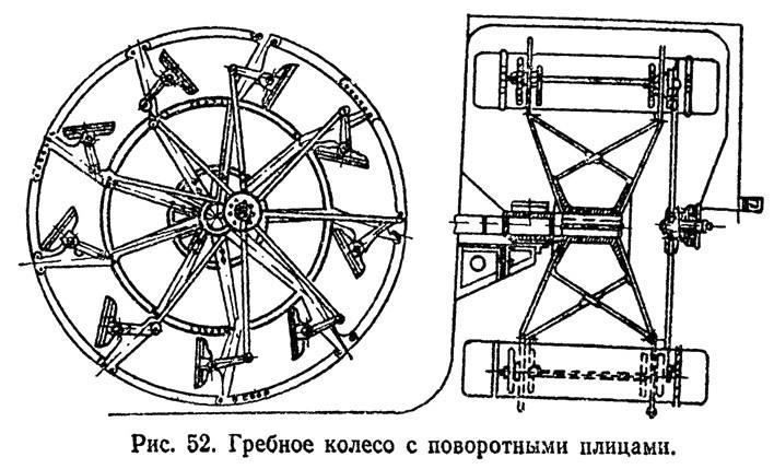 Глубоко копать не хочу. Честно – просто лень, да и дел поднавалило. Поэтому очень коротко, что вспоминается сразу без дополнительного поиска. Думается, что историю этого типа движителей можно начать с судового гребного колеса. Тут даже напрягаться не нужно – у «новации» с выставки даже внешний вид похож на лодку с четырьмя колёсами. Сейчас в основной своей массе люди думают (заметил по высказываниям в обсуждениях), что колесо – это какой-то анахронизм, а вот винт – это да! А ещё больше «ДА!» – это водомёт. Нет. На самом деле все эти движители относятся к «да». Просто они хороши в разных условиях. Водомёт лучше не ставить на буксир, а винт лучше не использовать на мелководье… и так далее. В моей практике был случай, когда для очень нового и очень «продвинутого» плавсредства мы использовали именно колёсный привод. И не ошиблись. Итак, колёса появились и стали быстро улучшаться. Например, были сделаны гребные колёса для пароходов с поворотными плицами. Вот такие, примерно: