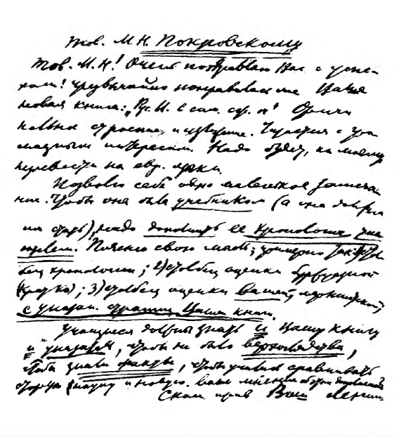 Тов. М. Н.! Очень поздравляю Вас с успехом: чрезвычайно понравилась мне Ваша новая книга: «Русская история в самом сжатом очерке». Оригинальное строение и изложение. Читается с громадным интересом. Надо будет, по-моему, перевести на европейские языки...