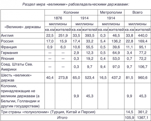 Таблица стран - колонизаторов из работы Ленина "Социализм и Война"