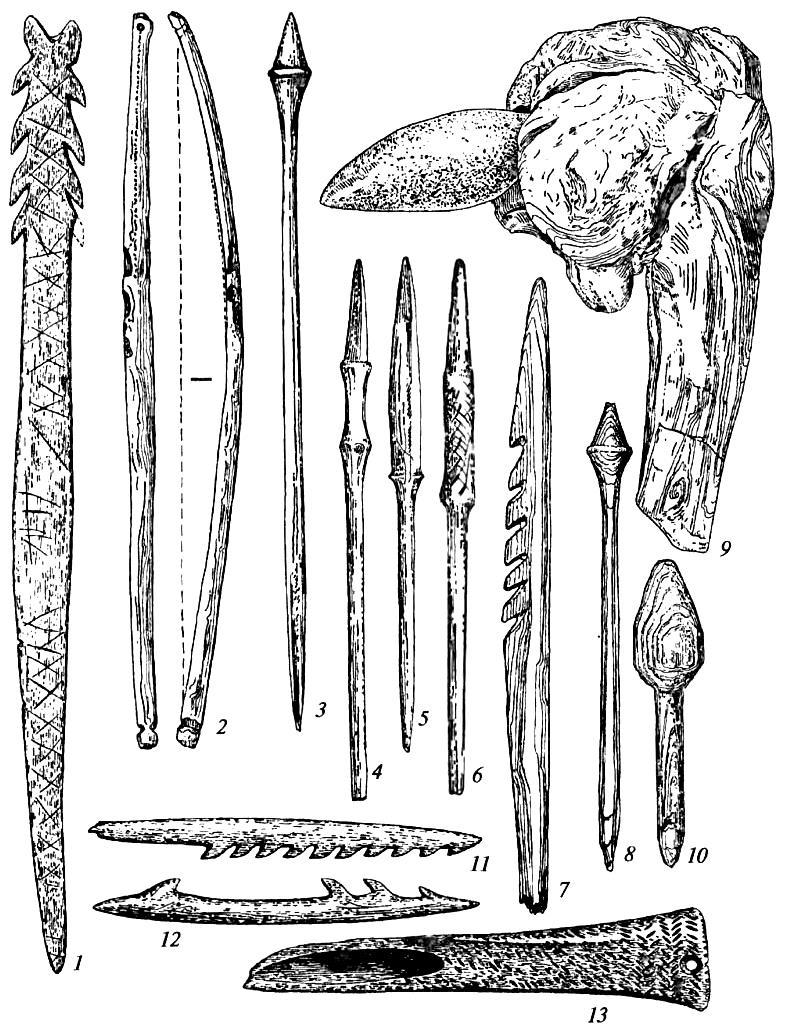 Как и сейчас у наиболее примитивных племен, древнейшие луки были невелики (60—80 см), слабы и применялись для метания неоперённых стрел, представлявших собой полое древко (тростинку) с гранёным деревянным наконечником (естественным шипом или обточенным куском твердого дерева). Вес цельнодеревянной стрелы не превышал 10—15 г (дерево — лёгкий материал, слишком же крупный наконечник создавал бы большое лобовое сопротивление, а баланс стрелы требовал, чтобы древко было тяжелее наконечника в 5—7 раз). Опасность для человека столь легкая стрела представляла только при стрельбе в упор, либо за счет яда. Позже стрела приобрела оперение и наконечник из кости или камня, а сам лук удлинился до 120 см. Стрелы с каменным листовидным наконечником весили уже до 50 г, что положительно сказалось на их убойной силе. Стрелы с костяным наконечником весили не более 25 г, но сам наконечник был более технологичен при изготовлении и мог иметь заусенцы. В такой комплектации лук стал уже вполне серьезным (по меркам мезолита) оружием, что позволило ему вытеснить пращу и бумеранг всюду, где он получил развитие.
