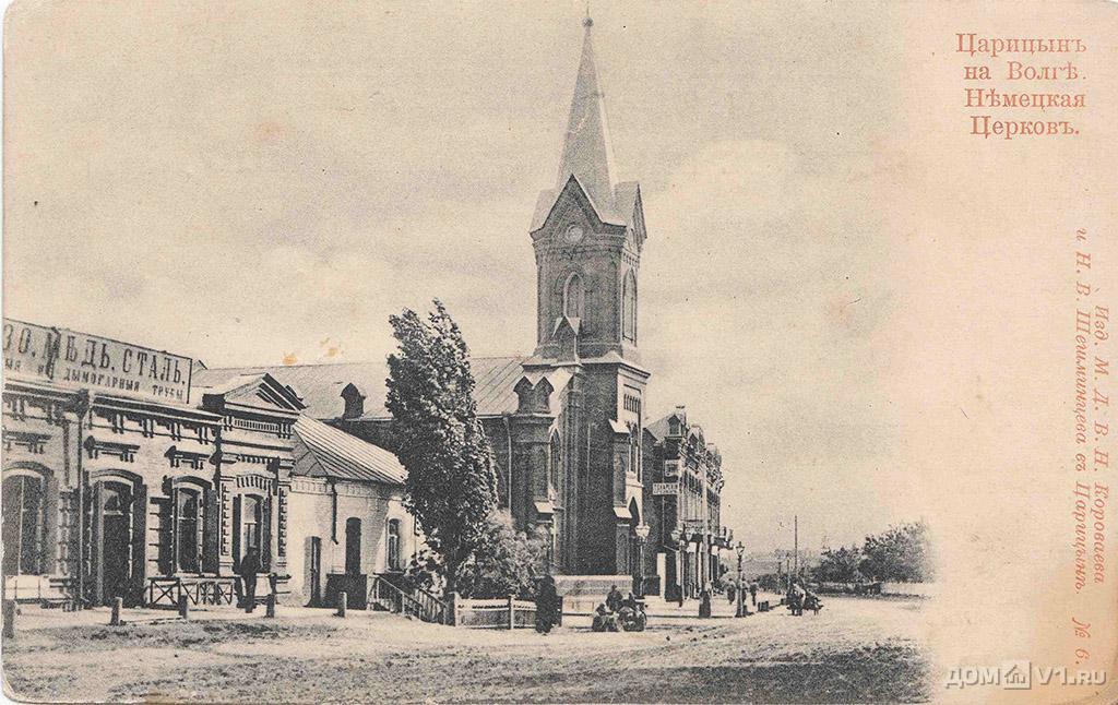 Возвращаемся в конец девятнадцатого века, когда оно было построено. Город во все времена был многонациональным и многоконфессиональным, поэтому на рубеже позапрошлого и прошлого веков в нём были разные храмы: православные, армяно-григорианские, католические, мечети, синагоги... Была в нём и лютеранская кирха, построенная в 1893 году и славившаяся своим органом так, что многие горожане и гости Города, даже исповедавшие другие религии, приходили в кирху послушать его. Из-за своего непривычного для Царицына "готического" вида кирха достаточно быстро стала одной из "визитных карточек" Города и попала на многие фотографии и открытки: