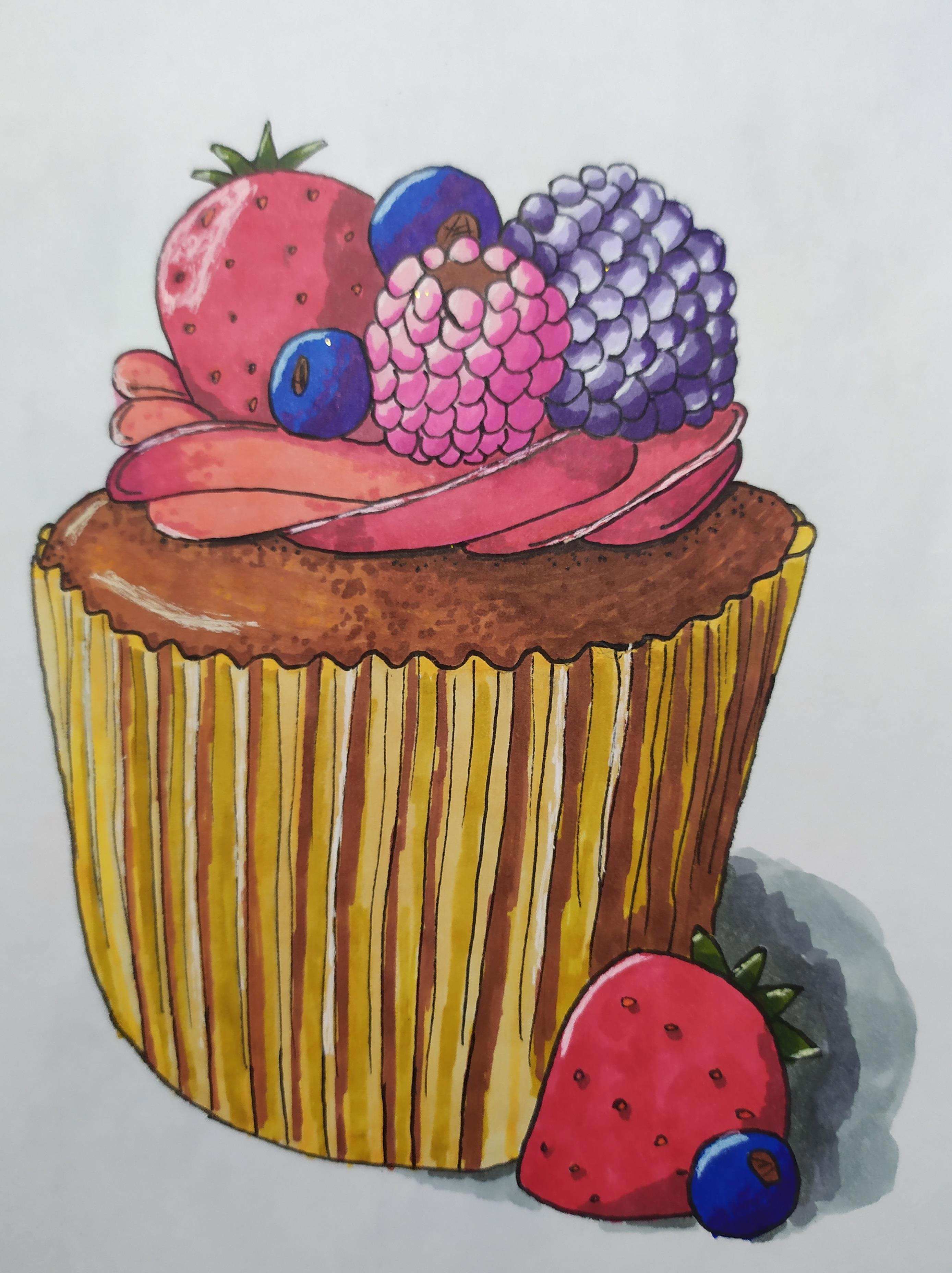 Получилось... ну как получилось. Признаться разукрашивать этими маркерами, не зная кучи нюансов, не так-то просто. Да и подобрать цвета из скудной коллекции не так уж и легко. Плюс, не повезло с обучающим видео. Девушка с ютьюба обрезала момент, где показывала как рисовать ягоды. И они нарисовались по моим собственным соображениям.