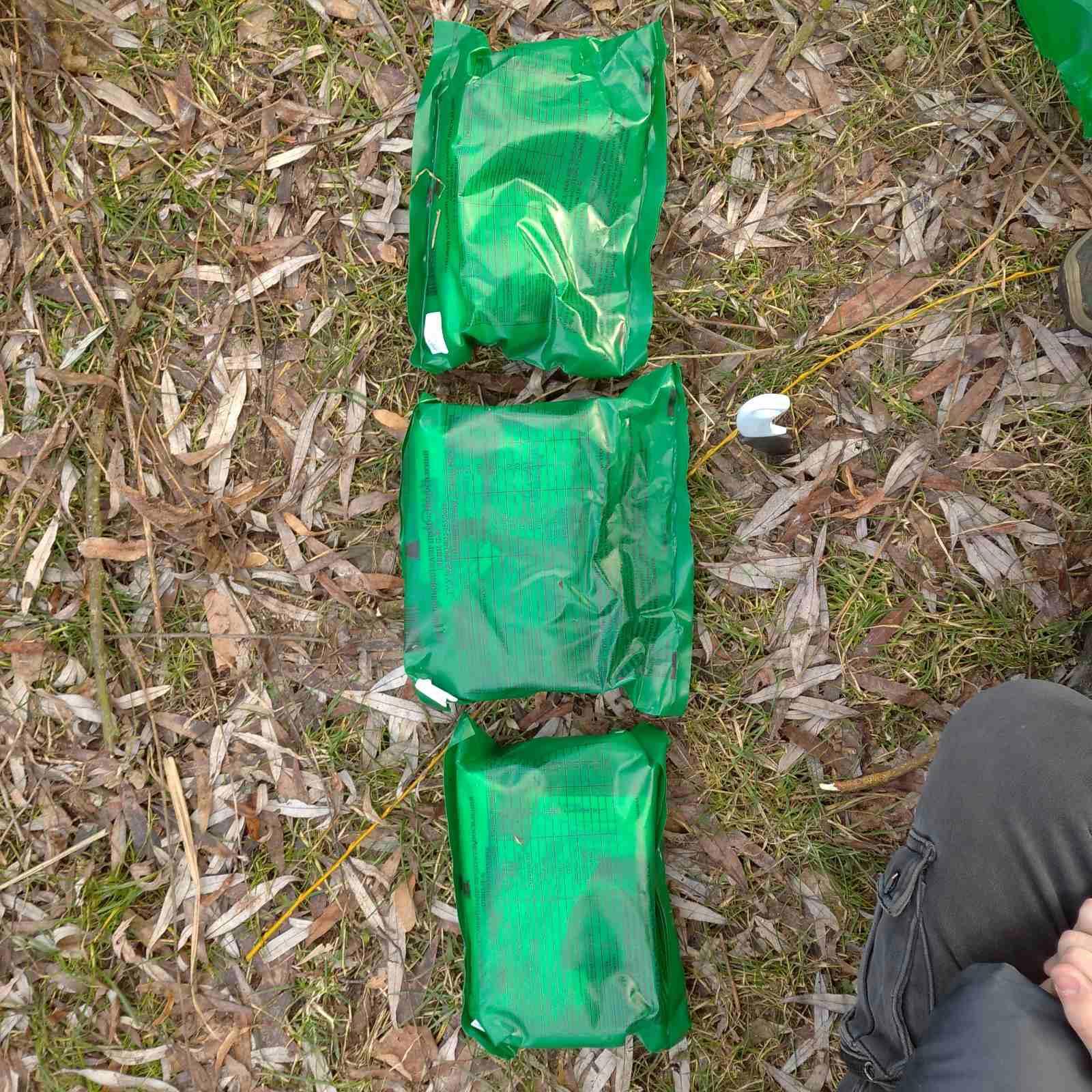 Это в пакете такие штуки, разогреватели, надо налить туда воды и положить пакет с продуктом, и оно нагреется за счёт химической реакции, но при -10 не работают и мы грели в котелке.