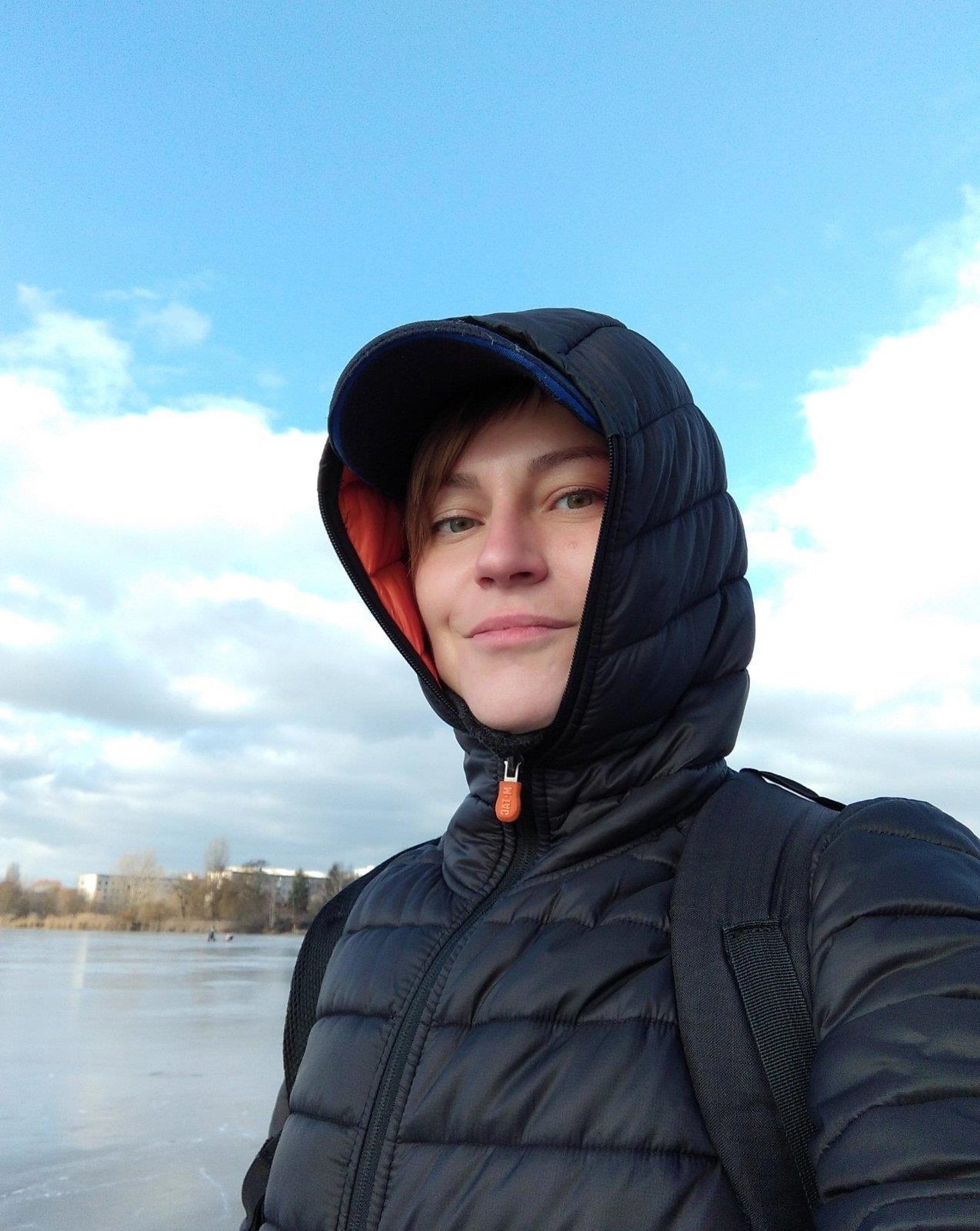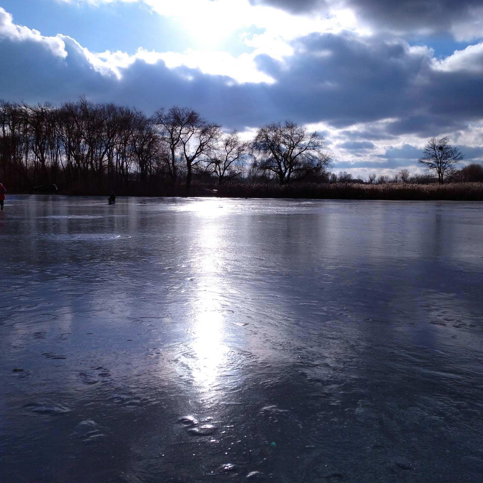 Река замёрзла, -8, солнечная дорожка на льду. Мы топаем открывать паёк. Люди ловят рыбу и катаются на коньках, я не умею ни то, ни другое.