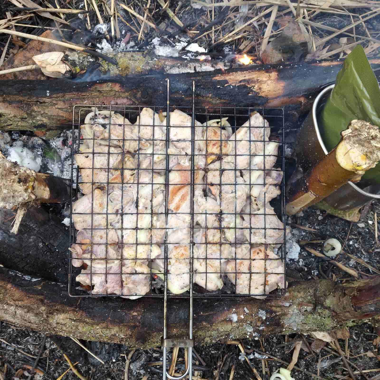 И тушёнка и каша были вменяемые, но я не верила, что это можно есть, пессимистам везде мерещатся обманы и ничего хорошего от жизни они не ждут, поэтому я взяла с собой свиную грудинку, курицу и водку. Очень жаль сейчас. Очень. Сбоку, в котелке, греется пакет с кашей.