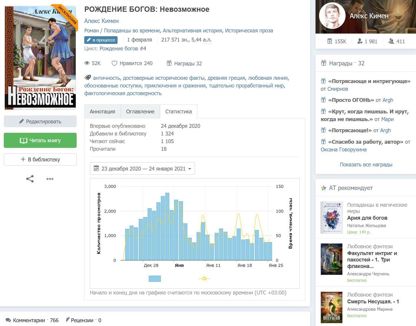 Автор: Алекс КименЯ чрезвычайно признателен Тимофею Царенко за его крайне информативный и откровенный пост. Для меня, как для автора целью которого является поиск своего читателя, этот рассказ явился откровением. Проанализировав предоставленные Тимофеем цифры и сравнив их со статистикой как его, так и своих книг, я пришел к неутешительным выводам о том, что многие правила и секреты успеха, которые внушают начинающим авторам на АТ не имеют под собой основания. И я покажу вам это на конкретном примере с цифрами.