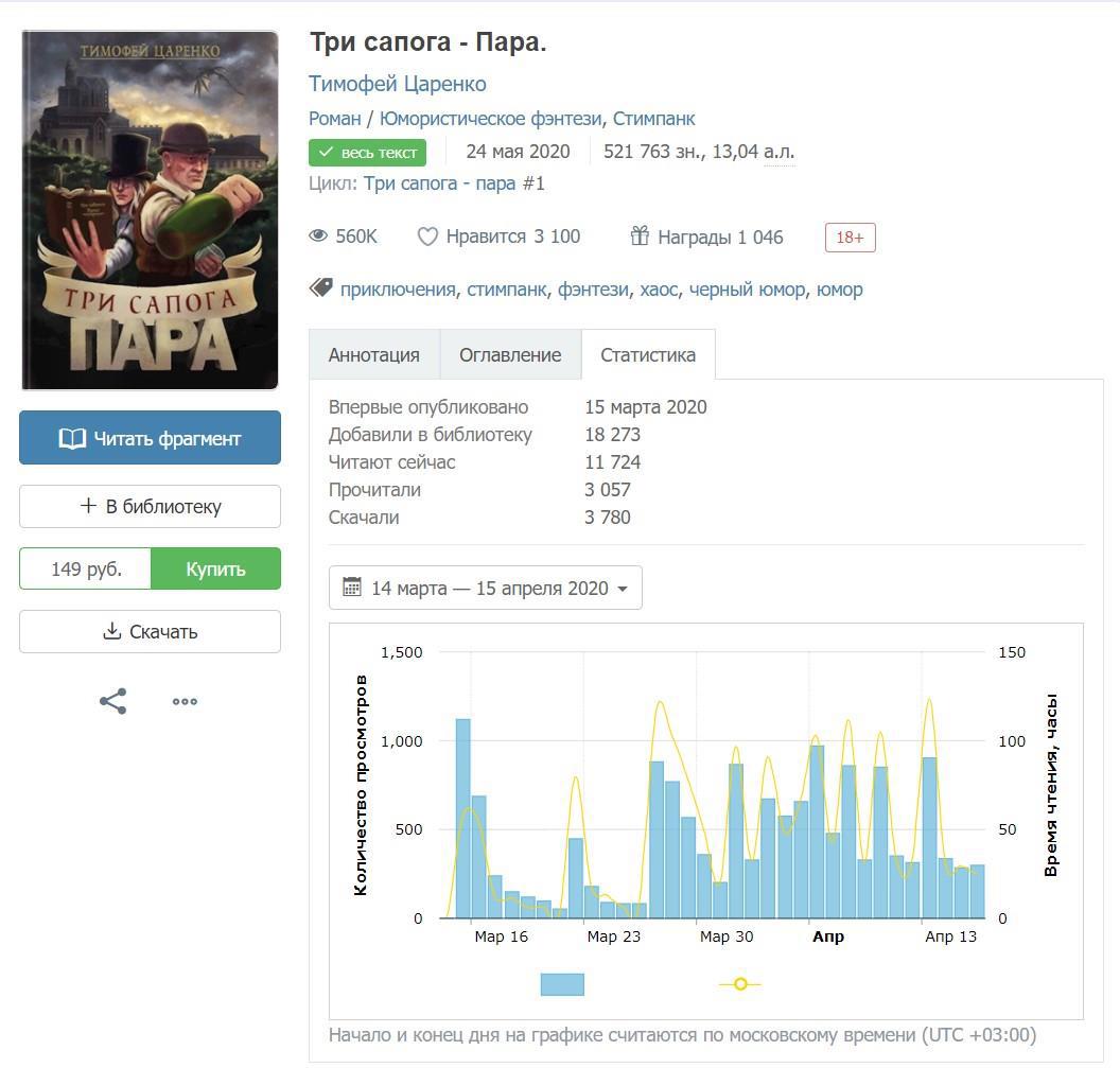 Итак: Тимофей начал выкладывать книгу 15 марта. В первый день, имея на тот момент не менее 20 000 подписчиков, он получил ВСЕГО 1200 просмотров и около 60 часов чтения!!! Сейчас, такие цифры не смогут вас вывести даже в виджет "Горячие Новинки" (ГН). Я уже не говорю, про виджет "Популярное". И далее из статистики видно, что ситуация не меняется. Каждая новая глава дает небольшой всплеск, на уровне 1000 просмотров и 80-100 часов чтения.