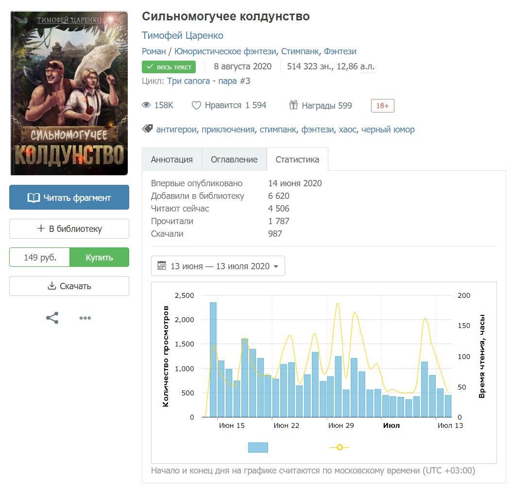 Второй (номинально третий) роман серии. Первый месяц выкладки. Смотрим: