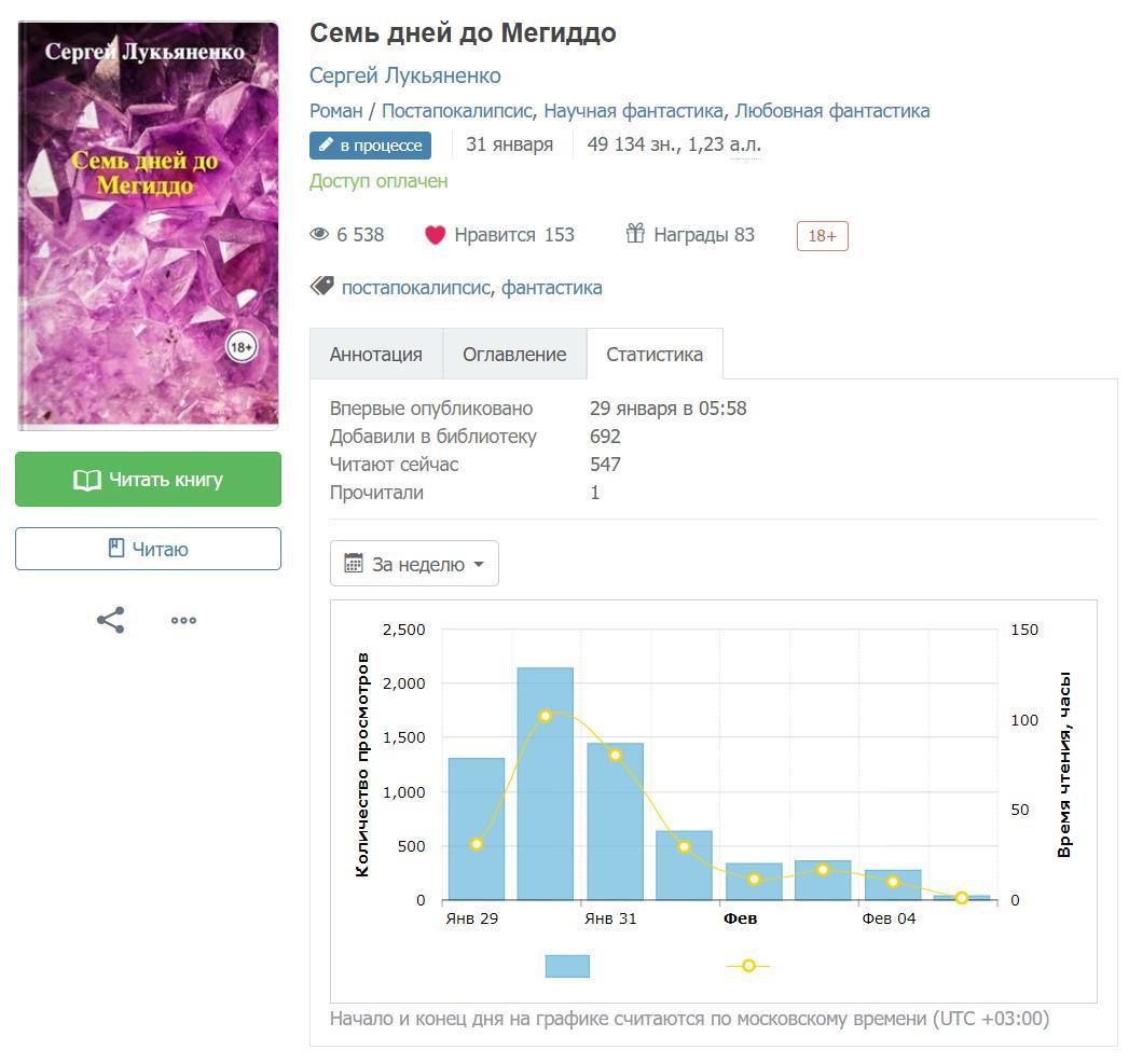 Показателен пример Сергея Лукьяненко. Признаюсь, я был уверен, что он с легкостью здесь найдет читателей и выйдет в ТОП, и даже агитировал Сергея перейти на АТ. Однако, смотрим на статистику его нового романа: