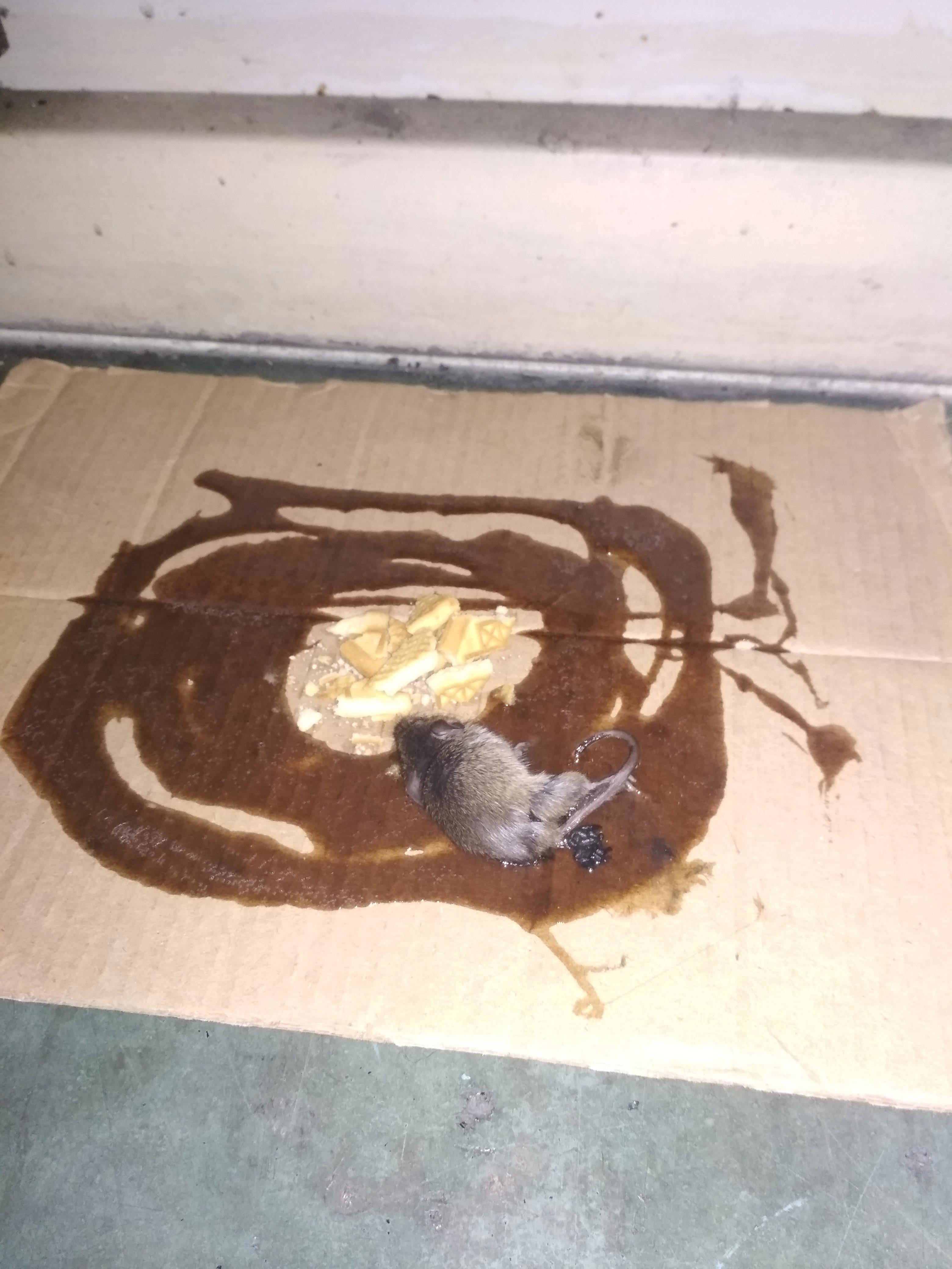 А вчера прихожу на работу с утречка, а там записка от напарника. Видел мышку. Положил ловушку с клеем для нее. Интересно попадется или нет?