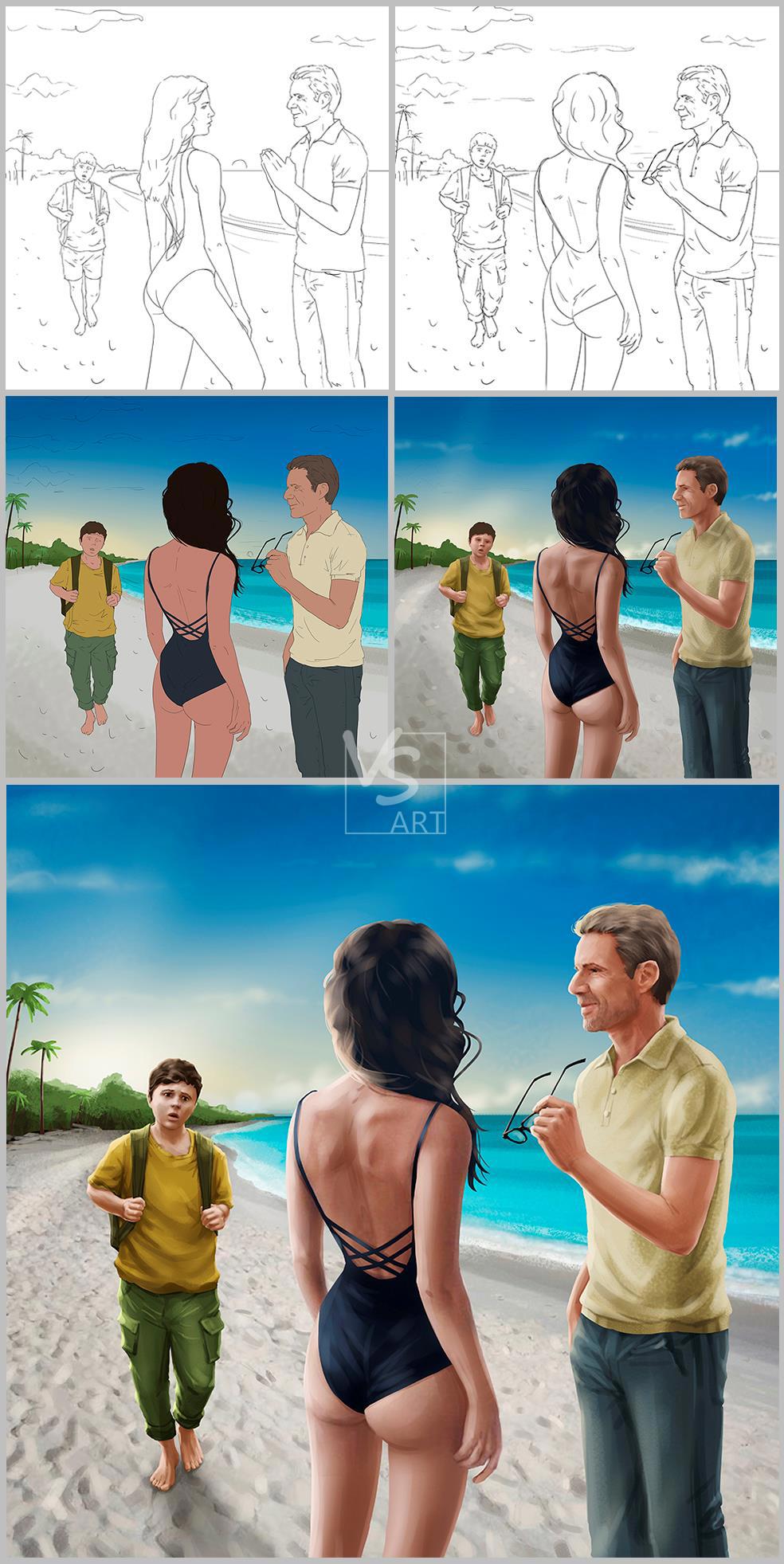 Автор: Салихов ВасильНесомненно главным объектом на этой иллюстрации должен был стать парень, подходящий к мирно беседующей паре, но как сделать, чтобы взгляд зрителя сразу же падал на него? Вопрос был решен в более четкой детализации и конечно же выражении лица. Удивление и даже некое возмущение должно читаться в его взгляде и в конечном итоге приковывать взгляд, но на сколько это удалось, решать вам.) Эскизов было немного, поэтому работа в цвете началась довольно быстро.
