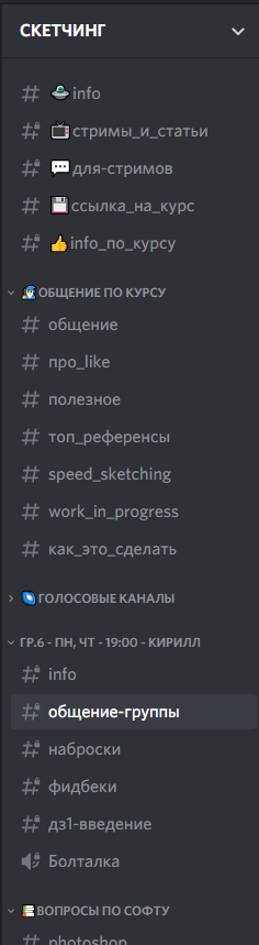 Сразу после покупки админы дают ссылку на сервер курса в дискорде, где есть разделы по разным темам. До учёбы доступен общий чат со студентами из разных потоков (сразу скажу, общение там не шибко активно идёт, оживает только раздел со стримами во время стримов), а за несколько дней открываются разделы для общения конкретно твоего потока, а еще - раздел с ссылками на познавательные стримы и статьи от создателя курса (об этом будет ниже)