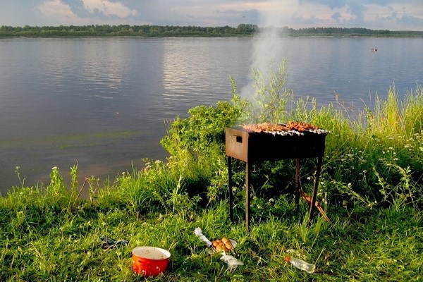 *Пришел на берег озера, установил мангал, нанизал мясо и разложил жариться. Сам лег на траву и налил себя коньяку*