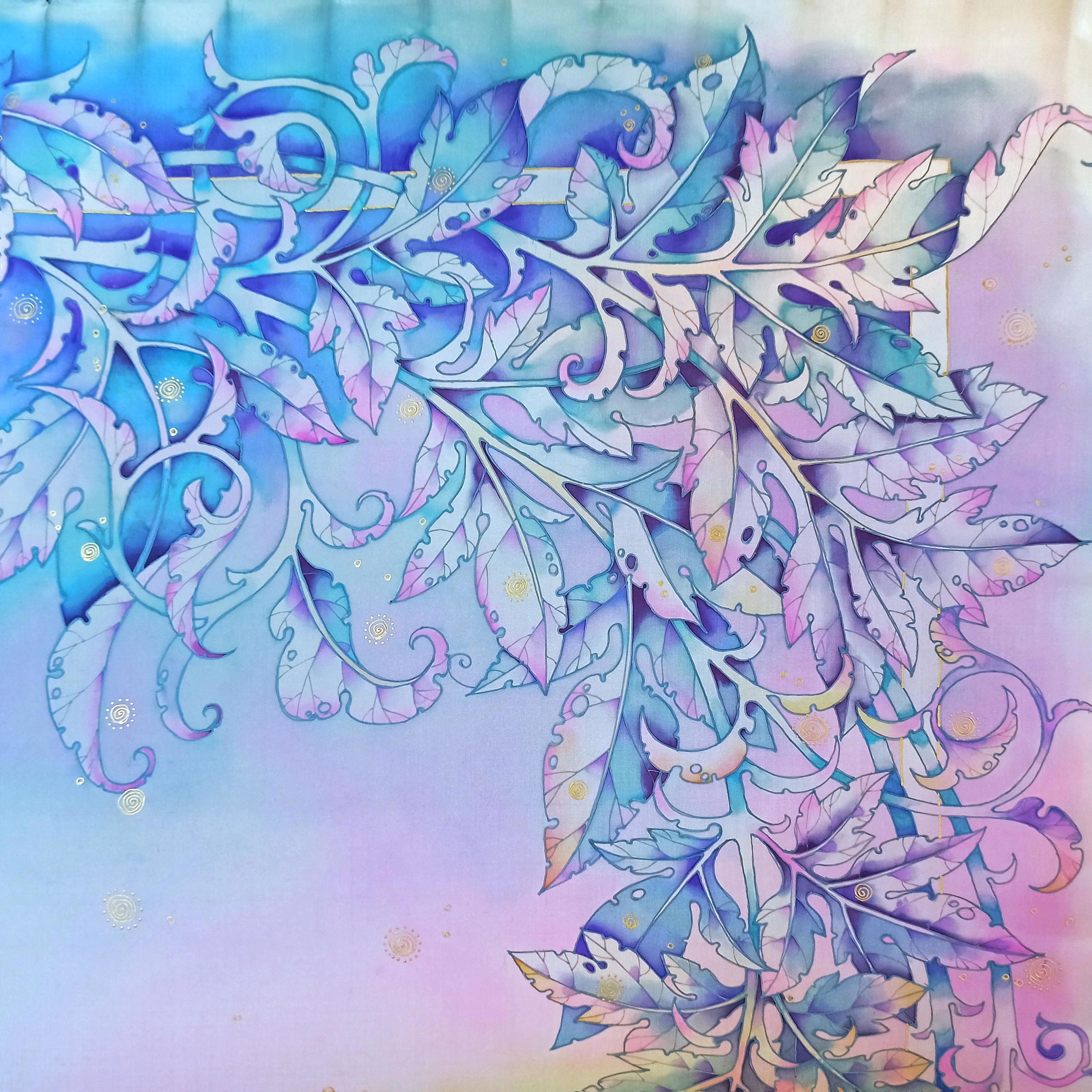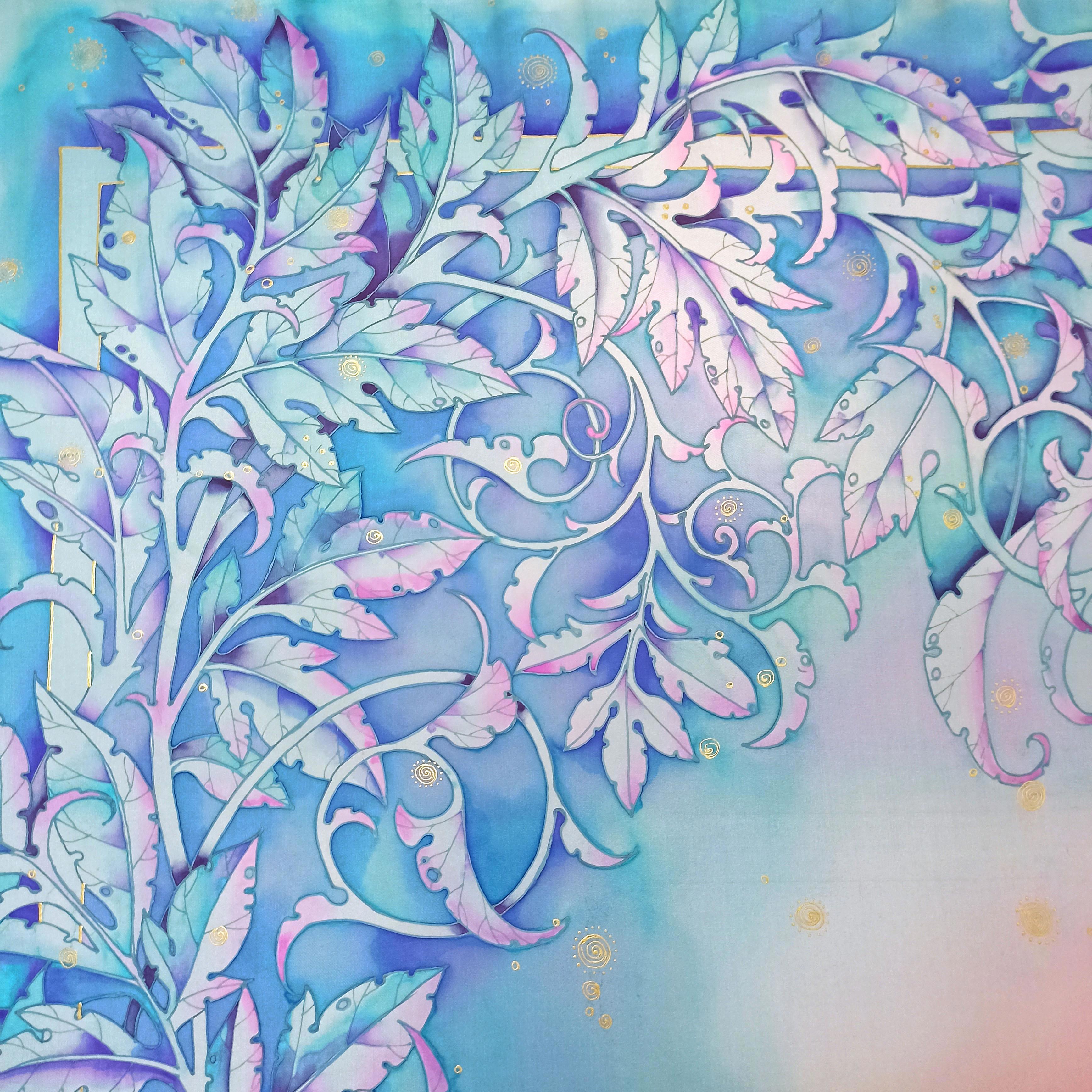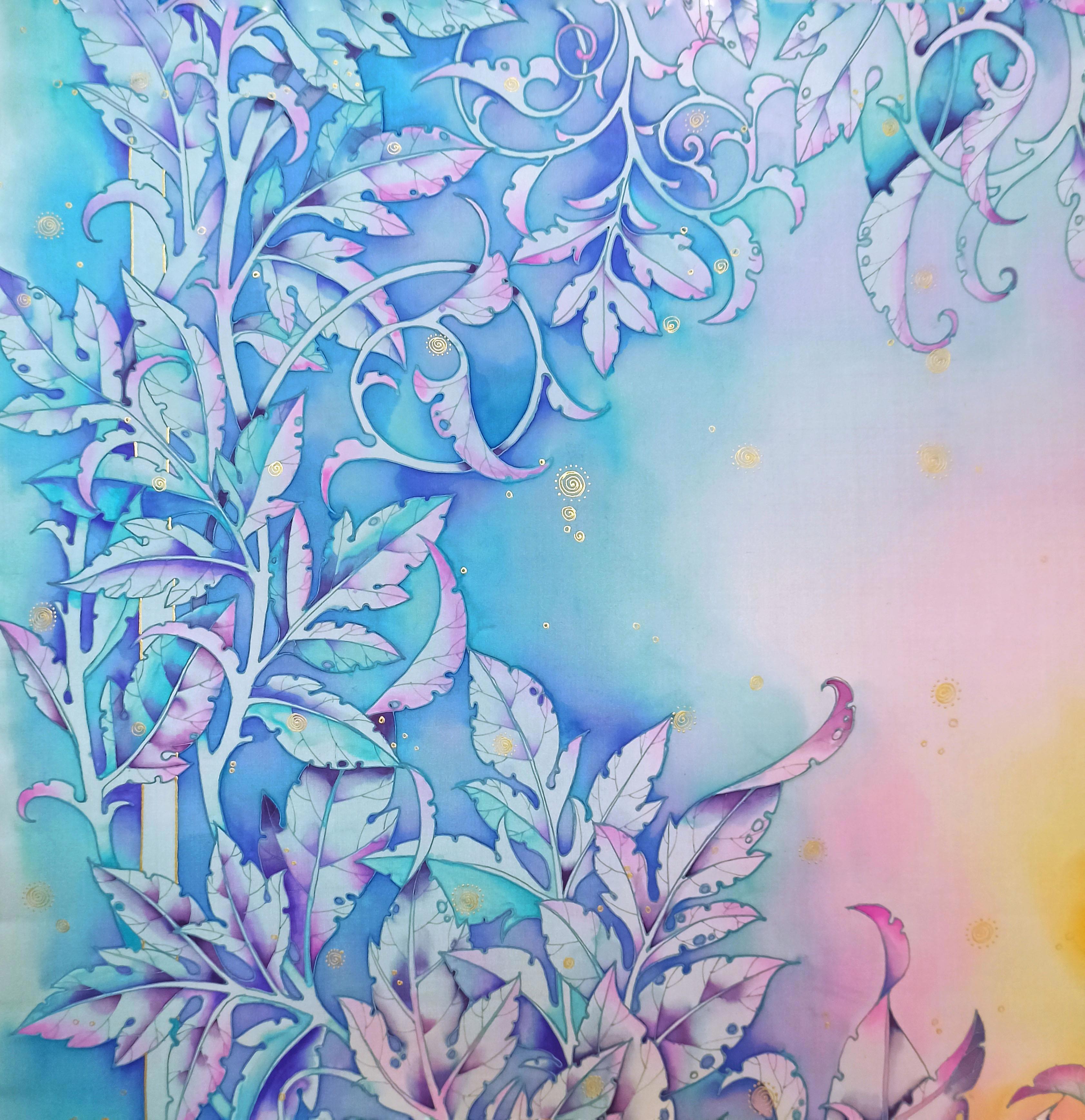 Это золотой солнечный зайчик скачет по морозным веткам и листьям, кружится посолонь, разгоняя колесо года, приближая весну:)) Большой шёлковый платок, 114х114, холодный батик, парозакрепляемые краски:))