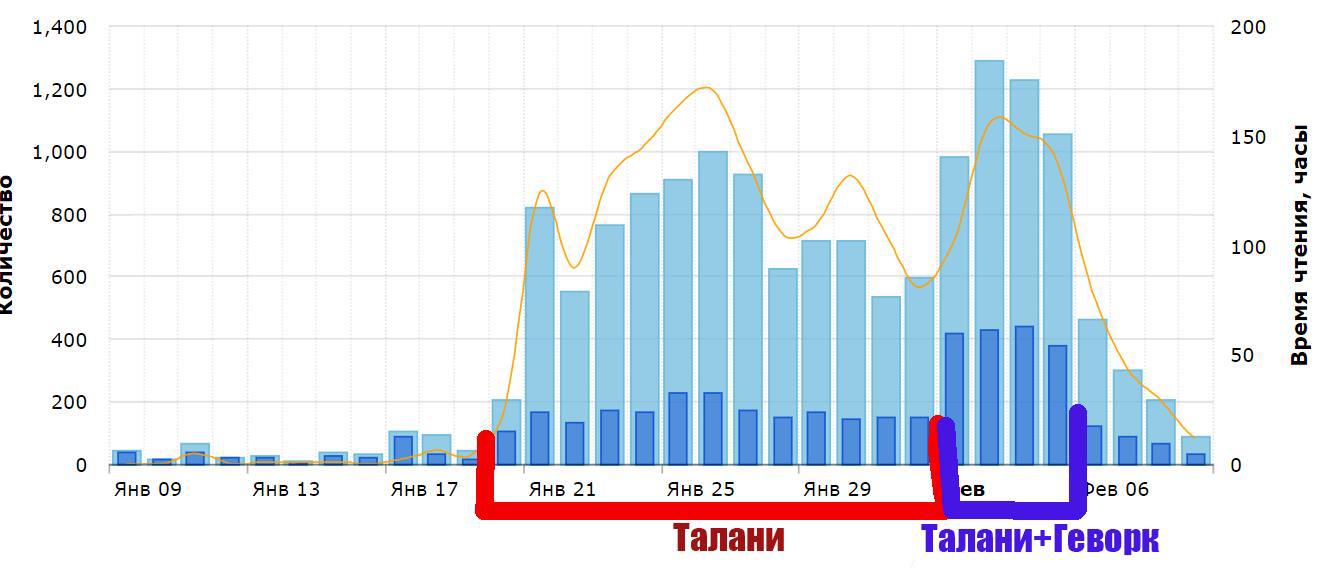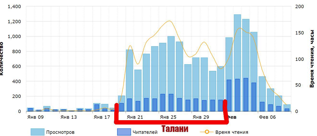 На графике видно, как поднялись часы чтения уже на следующий день. Но здесь надо учитывать, что мой роман имеет 25 алок и набрать время чтения с таким количеством знаков, не составляет проблемы. Достаточно одному ли двум людям вчитаться.
