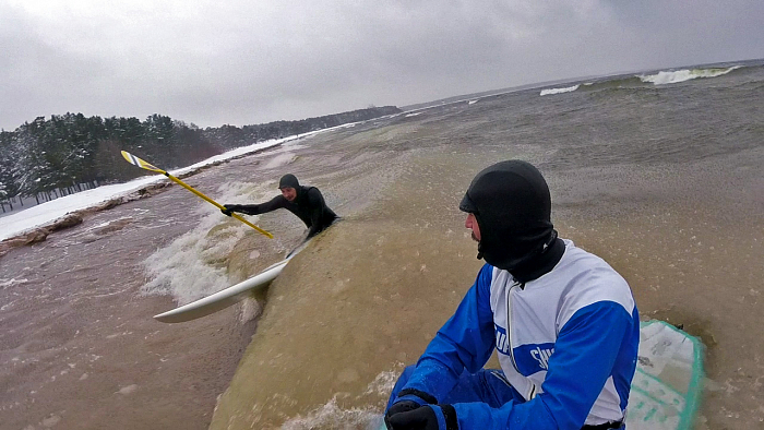 И, если в начале зимы экстремалы катались по зимним волнам на сёрфе,