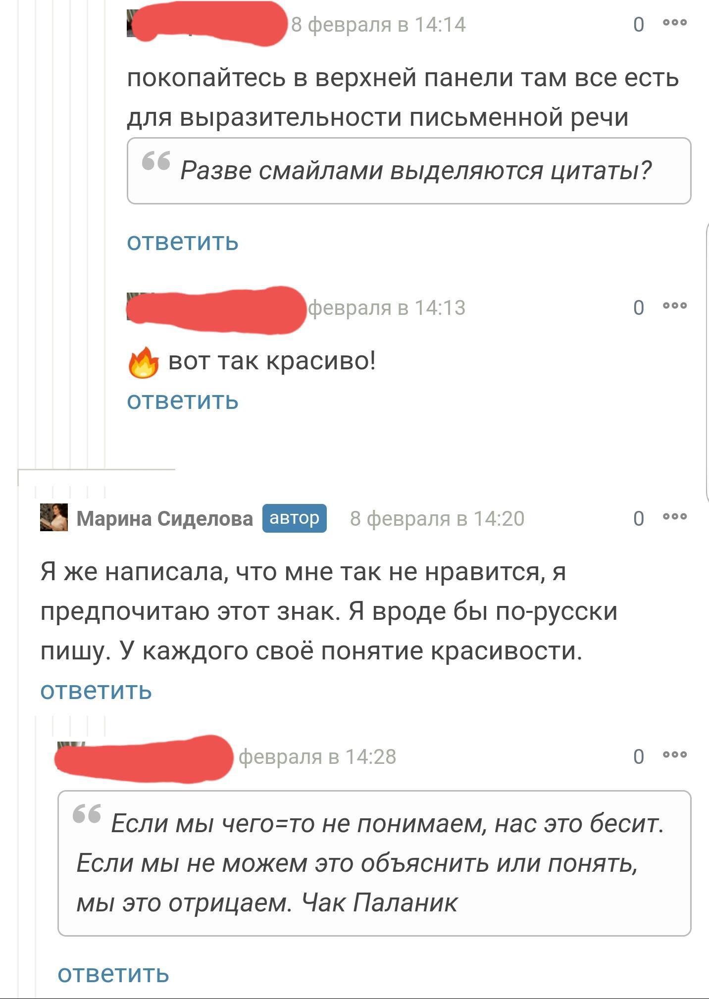 Мои личности живут по принципам — уважай чужое мнение и не лезь в чужой монастырь со своим уставом. Но здесь, видимо, царят другие принципы. Вот, например, давеча один товарищ высказал негодование по поводу знаков копипаста, мол, режет глаз, мол, чтобы выделить текст есть другой способ на панели инструментов. Но нам так удобнее, — ответили мы и нас обвинили в невежественности.