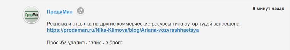 Автор: Ника КлимоваРазмещаю я свои писульки помимо тут, еще и на Продамане. В том числе и блоги там пописываю. И оставляю ссылки на сайт АТ. До сегодняшнего дня проблем не возникало. А буквально только что от администрации Продамана получила вот такое сообщение