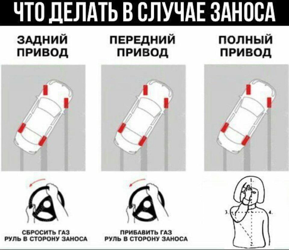 3. Полный привод. Действия аналогичны с полным приводом. Ни добавлять газ, ни сбрасывать его нельзя. Необходимо держать его «в натяг». Нужно быть более аккуратным – в случае начала заноса машину будет выровнять сложнее, нежели передний или задний привод по отдельности. Не просто так ходит множество шуток – если понесло на полном приводе, то молитесь.