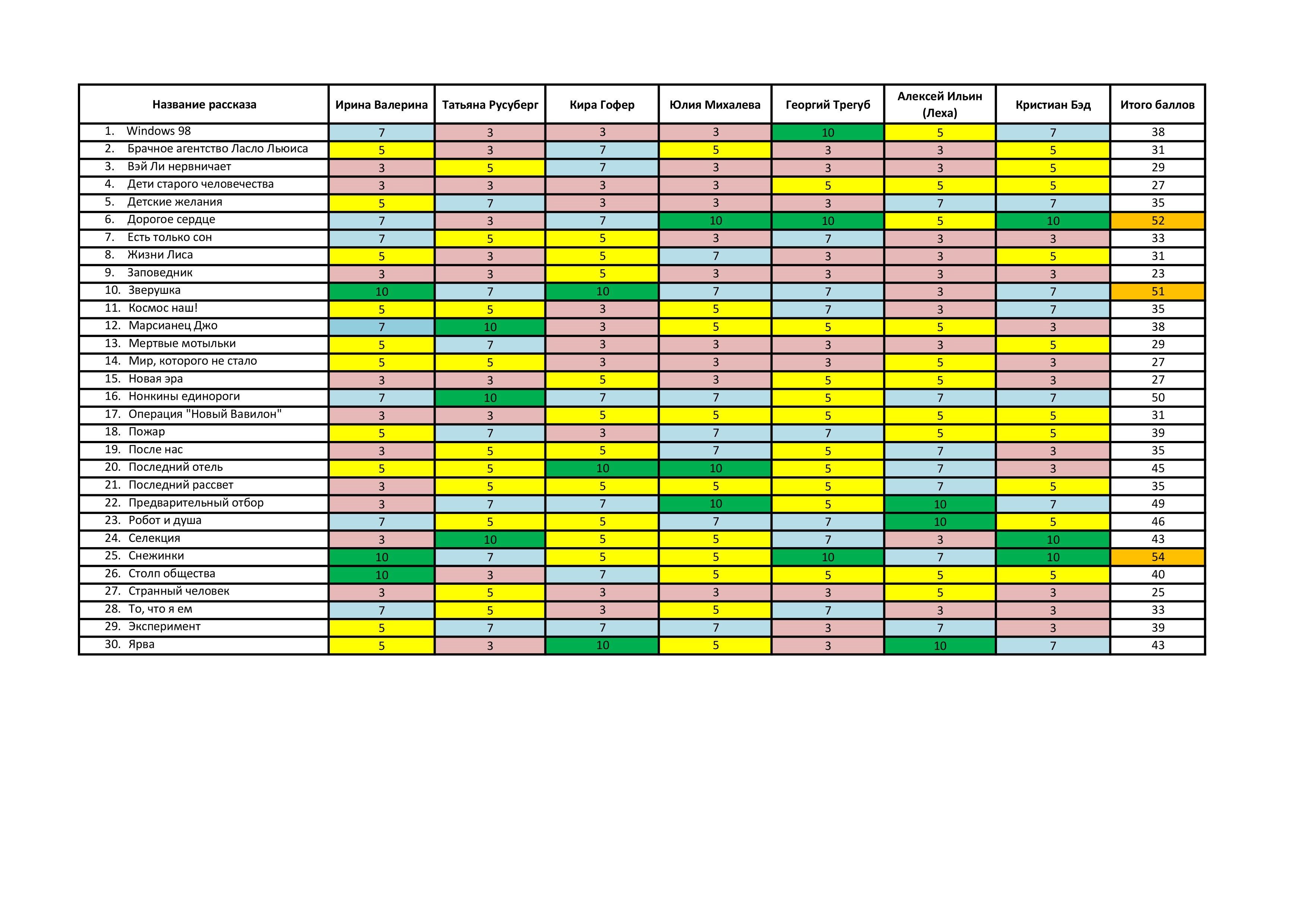 Результаты голосования жюри в таблице ниже. Судьи голосовали независимо друг от друга, имена финалистов им известны не были. Каждый судья должен был выставить три оценки по 10 баллов, семь оценок по 7 баллов, по десять оценок по 3 и 5 баллов. Соответственно, данные баллы следует воспринимать как способ разбивки финалистов на условные группы, а не оценки рассказов по десятибалльной шкале. Победителем признается рассказ, набравший наибольшее количество баллов.
