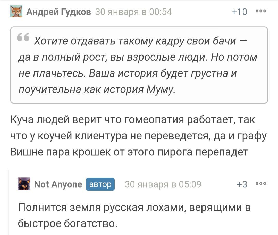 Хитрый Вишневский переманивает клиентов таргетологов к себе в Школу (один из топ-3 в плане бреда из комментов "обличителей", ибо Вишневский совершенно не против грамотной работы с таргетологами, но это мелочи), и эти наивные ребята, которых так жаль грамотным и прошаренным спецам из Флудилки, не ведущимся на всякие тренинги-хуенинги, даже не представляют, как лоханулись.