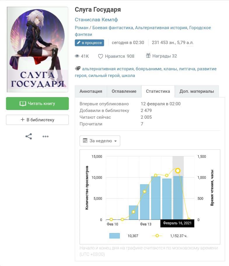 Краткая информация. Публикуется на АТ с октября 2018 года. С того момента на его бесплатной первой книге набралось чуть больше 1700 библиотек. На второй, платной, начатой в феврале 2019 года и законченной в октябре 2020 года - набралось 890 библиотек.