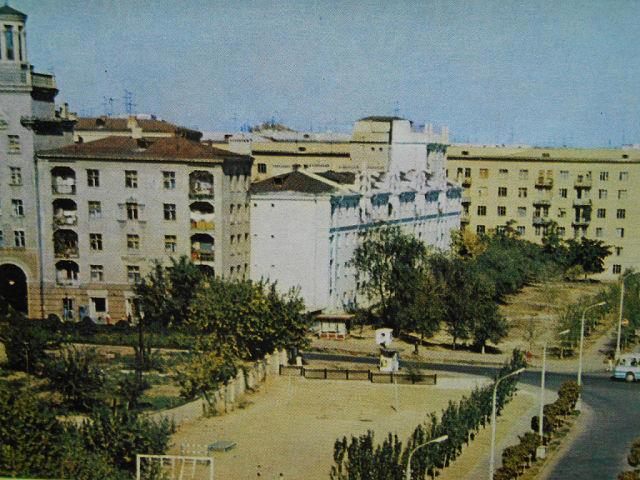 Второе фото сделано чуть ниже. Видна бульварная часть Краснопитерской (ныне улицы Чуйкова), на круглой площадке которой в 1995 году будет поставлен замечательный памятник мирным жителям погибшим во время Сталинградской Битвы, который в народе принято называть "Бомбой" - он тоже заслуживает отдельной истории, а улицы Комсомольской уже нет - вместо того, чтобы продолжаться к Волге напрямую, спуск на Набережную делает крутой левый поворот:
